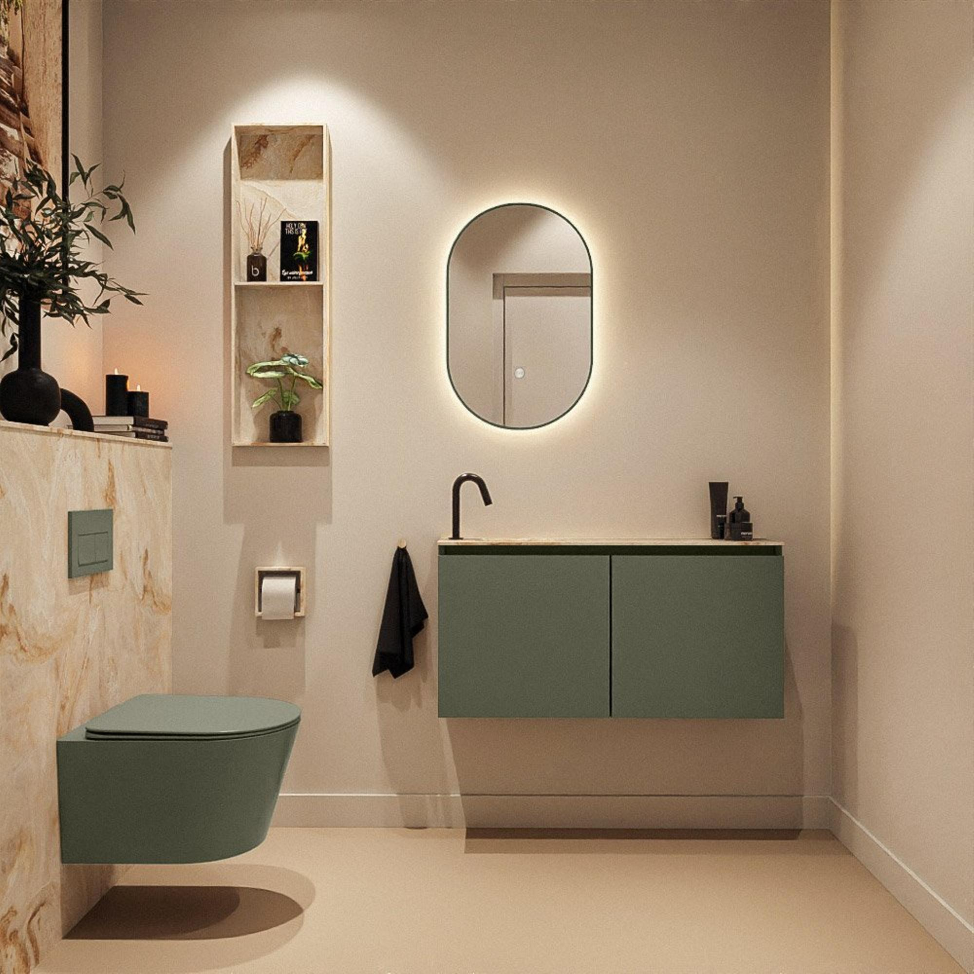 Le caisson est réalisé en MDF vert Army, une couleur contemporaine qui donne immédiatement plus de caractère à votre WC ou salle de bains. Cette teinte de vert profond se combine très bien avec des robinets noirs, du métal brossé ou, au contraire, du chrome classique. Les façades sans poignées offrent une apparence moderne et épurée et évitent que des poignées saillantes ne gênent la circulation dans un petit espace. Les deux portes offrent un espace de rangement surprenant pour les articles de toilette, tandis que la technique softclose garantit une fermeture silencieuse : agréable si vous utilisez le meuble de manière intensive ou si vous entrez encore dans la salle de bains tard le soir. Vous profitez ainsi chaque jour de confort, de tranquillité et d’une apparence bien ordonnée.