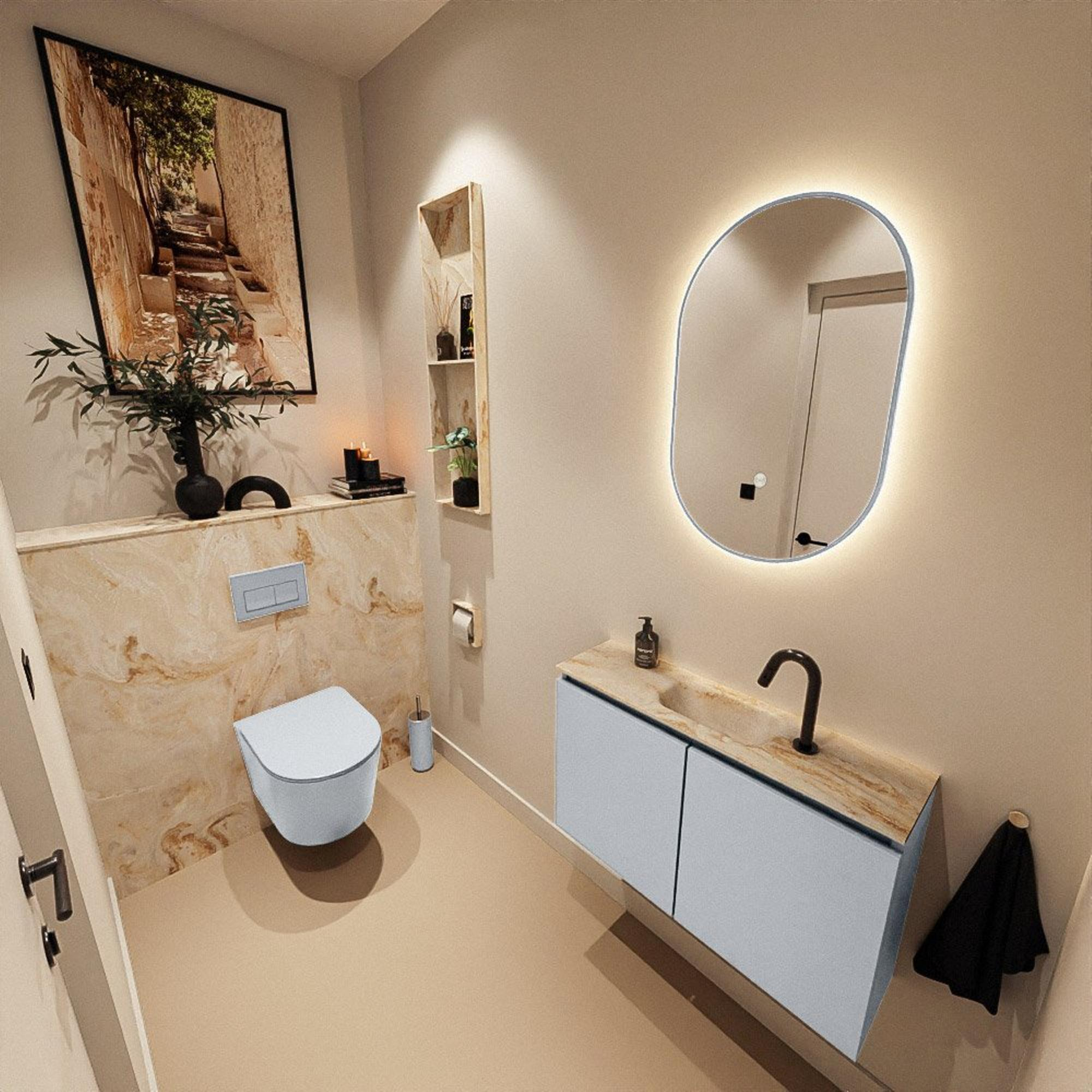La combinaison de la couleur Clay pour le meuble et de la vasque Eden en Frappe donne immédiatement à vos toilettes une allure contemporaine et chaleureuse. Clay est une teinte terreuse grise et douce qui se marie très bien avec des carreaux blancs, couleur sable ou aspect béton, ainsi qu’avec des robinets noirs ou en métal brossé. La vasque beige Frappe s’y accorde parfaitement et crée un ensemble apaisant avec une touche de luxe subtile. Grâce à la façade sans poignées, le meuble affiche un style minimaliste et moderne, sans devenir froid pour autant. C’est un excellent choix si vous souhaitez une ambiance hôtel dans un petit espace, tout en bénéficiant d’un rangement pratique derrière les portes. Ainsi, vos toilettes restent non seulement agréables à regarder, mais également bien ordonnées.