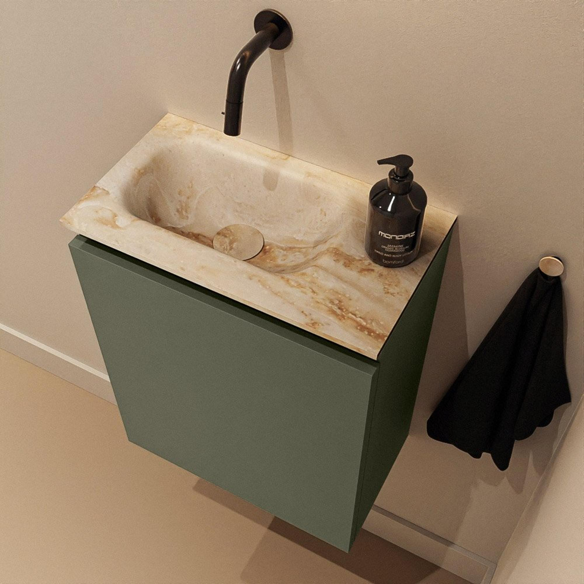 Les façades lisses sans poignées et la couleur Army confèrent immédiatement à vos toilettes une ambiance moderne et design. Le meuble peu profond de 40x23x50 cm paraît léger et discret, ce qui donne à la pièce une impression de grandeur et de calme. La vasque Eden dans la douce teinte Frappe s’y accorde parfaitement : une nuance beige chaleureuse qui se combine à merveille avec des accents verts, noirs et en laiton. Grâce à la position du lavabo à gauche, il se crée de l’autre côté une partie de plan de dessus dégagée, pratique par exemple pour un distributeur de savon ou un élément décoratif. Vous profitez ainsi d’un meuble WC compact qui n’est pas seulement pratique, mais qui contribue aussi réellement à l’atmosphère de votre intérieur.