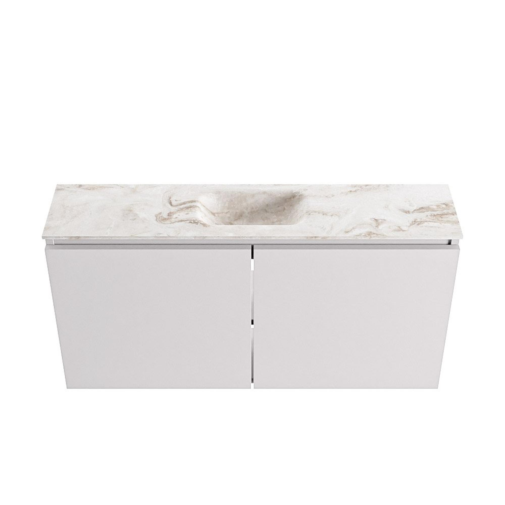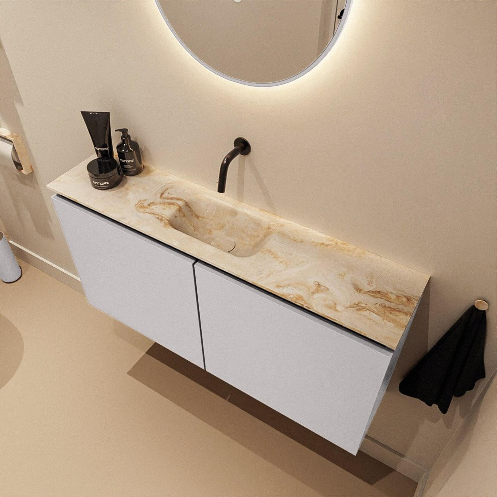 Vous recherchez un meuble WC sobre et moderne qui convient à un espace compact tout en ayant un aspect luxueux ? Alors cet ensemble avec meuble sans poignée et fin plan de lavabo est un choix judicieux. Avec une largeur de 100 cm et une faible profondeur, vous créez une surface de pose généreuse sans que le meuble ne dépasse trop dans l’espace. Idéal pour un WC ou une petite salle de bains où vous souhaitez combiner style et fonctionnalité. L’association du meuble chaleureux Cale avec un lavabo en solid surface beige dans la couleur Frappe offre un aspect doux et moderne qui s’harmonise parfaitement avec les tons naturels, l’effet béton ou des carreaux blancs épurés. Comme le lavabo est placé au centre et qu’il n’y a pas de trou de robinet, vous avez toute liberté pour choisir un mitigeur posé ou un mitigeur encastré assorti et ainsi prolonger votre propre style dans toute la pièce.