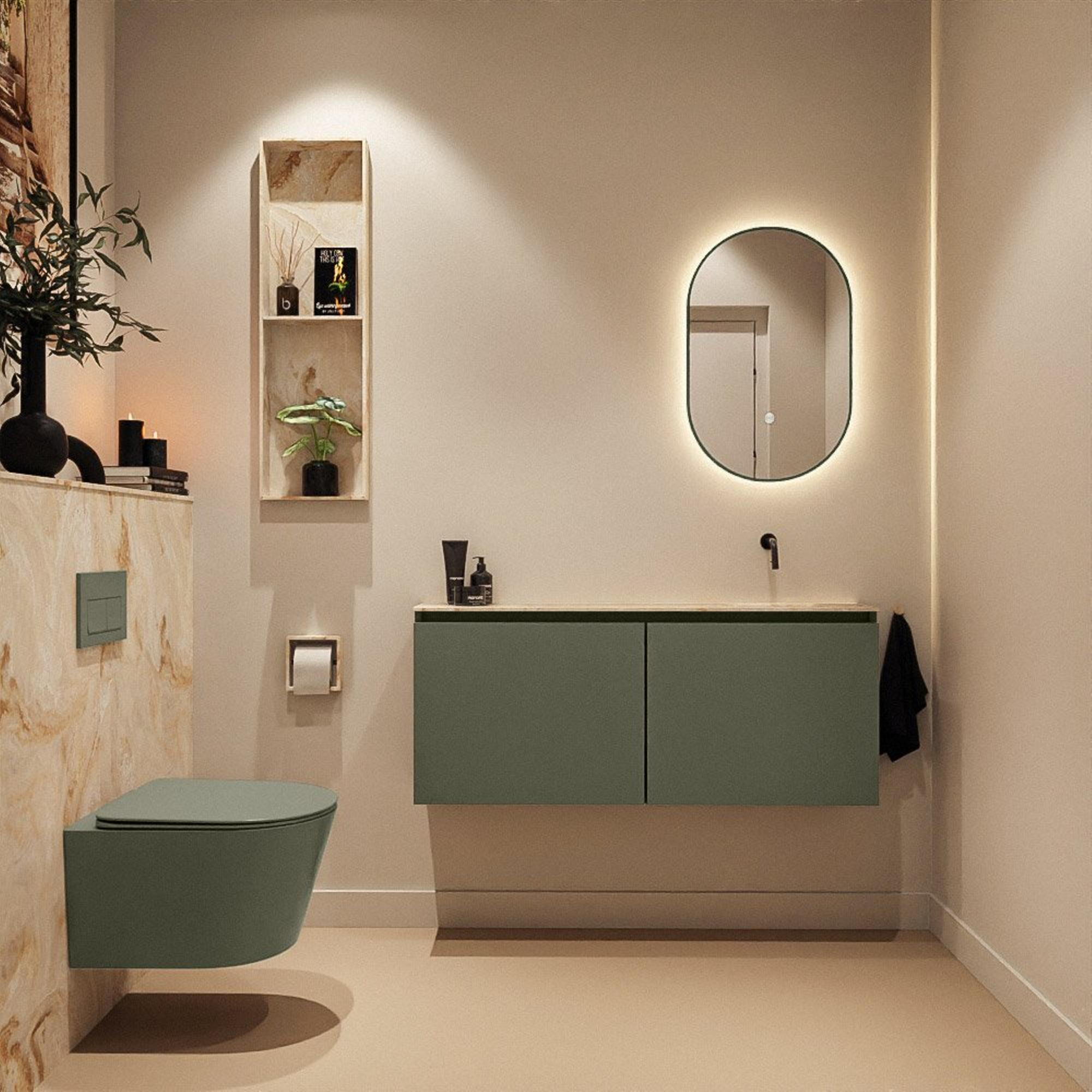 La couleur profonde Army du meuble apporte chaleur et ambiance à vos toilettes, sans être criarde. Cette teinte de vert moderne s’accorde parfaitement avec des styles d’intérieur populaires tels que hôtel chic, scandinave ou industriel moderne. Le lavabo Eden en Frappe - une teinte beige douce - forme un contraste subtil avec le meuble sombre et offre un aspect luxueux, presque comme un meuble design. Le plan en solid surface se prolonge sans joints dans le lavabo intégré, ce qui n’est pas seulement chic visuellement, mais aussi pratique à l’entretien. Grâce à la finition du plan sans trou de robinet, vous pouvez vous-même choisir un robinet surélevé assorti, mural ou posé sur le plan (si percé par l’installateur), afin d’harmoniser totalement le look avec le reste de votre équipement sanitaire.