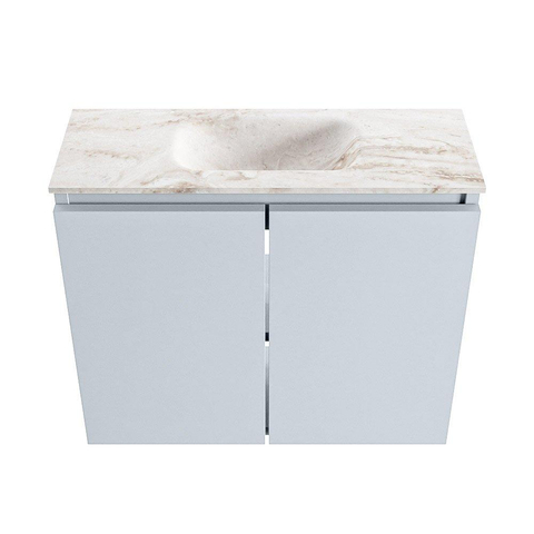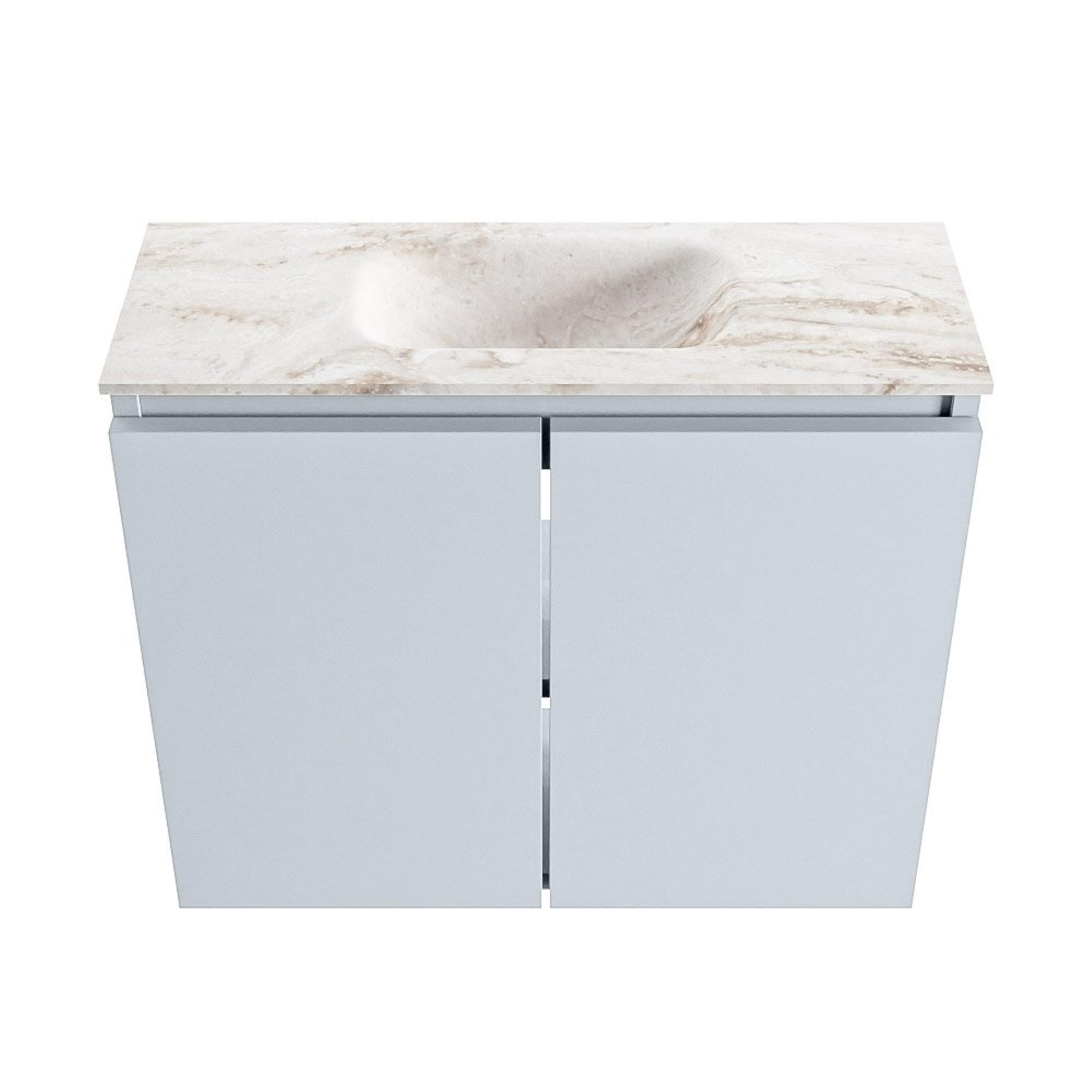 La combinaison de la couleur Clay pour le meuble et du lavabo EDEN couleur Frappe crée un look moderne et doux qui s’accorde parfaitement avec les nuances beiges, sable et grises du reste de la pièce. La façade sans poignée offre une apparence épurée et minimaliste, sans interruption dans le panneau frontal. Il en résulte un ensemble harmonieux qui convient parfaitement à un style moderne ou hôtel chic. Les tons neutres sont en outre intemporels, ce qui vous permet de combiner facilement des accessoires comme des robinets et accessoires de WC noirs, chromés ou en métal brossé, sans que l’ensemble paraisse chargé.