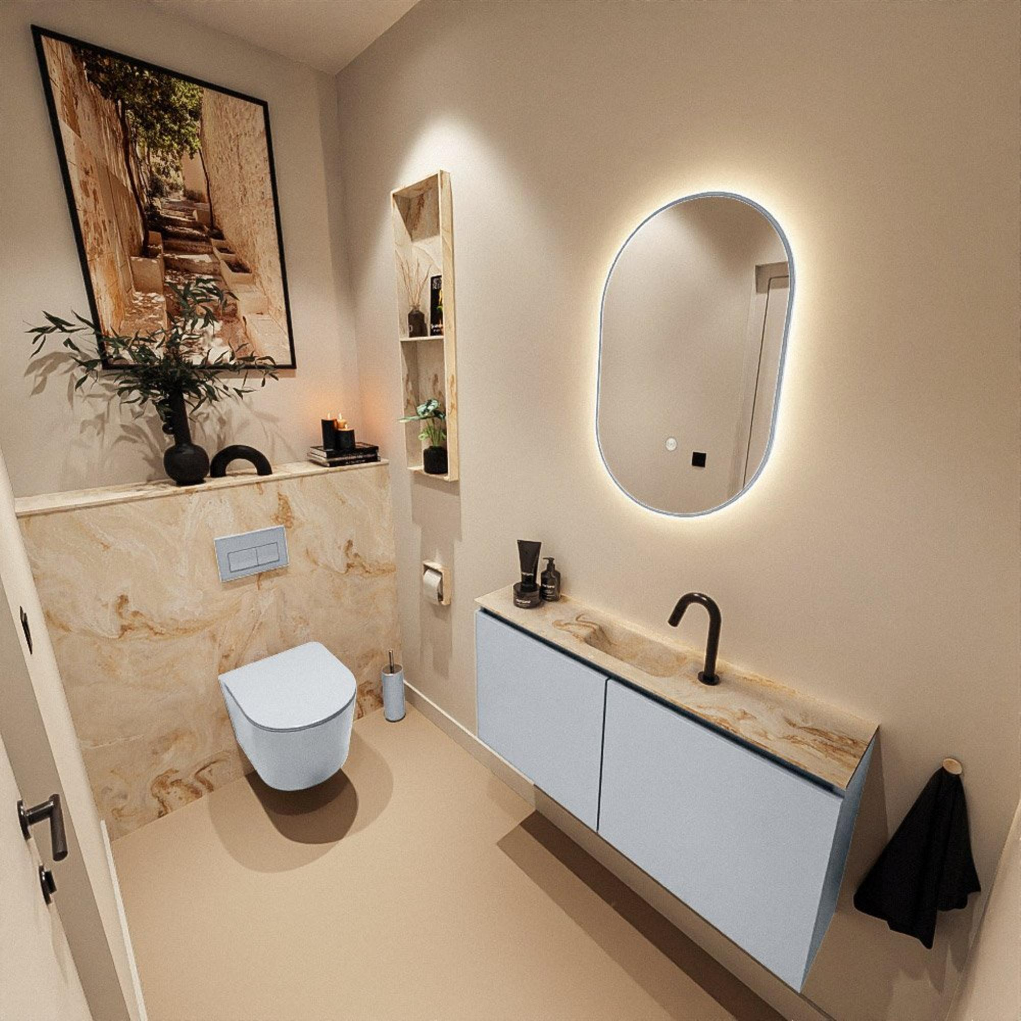 Le meuble de couleur Clay forme une base moderne et chaleureuse qui s'intègre à merveille aussi bien dans des intérieurs minimalistes que dans des ambiances type hôtel chic. Le lavabo EDEN en Frappe y ajoute une touche douce et claire, comparable à une pierre naturelle claire ou à un solid surface beige. Ensemble, ils créent une palette de couleurs raffinée qui se marie bien avec des carreaux gris, couleur sable ou effet marbre blanc. La façade sans poignées assure un jeu de lignes épuré sans interruption, donnant au meuble l'apparence d'un bloc calme dans l'espace. Votre toilette gagne ainsi immédiatement en standing, comme si vous entriez dans un hôtel design.