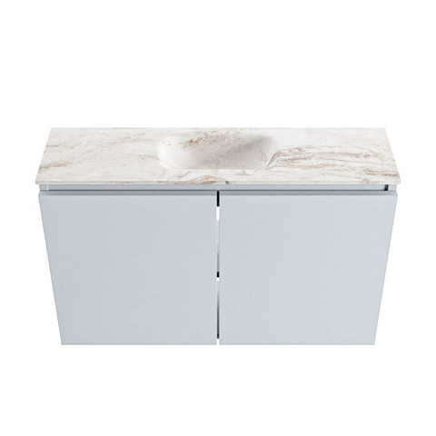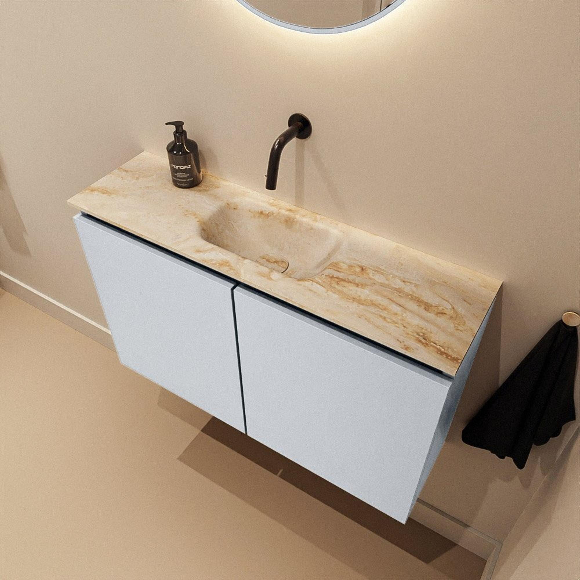 - Plan de lavabo Eden élégant en couleur Frappe, avec un luxueux aspect marbre beige.