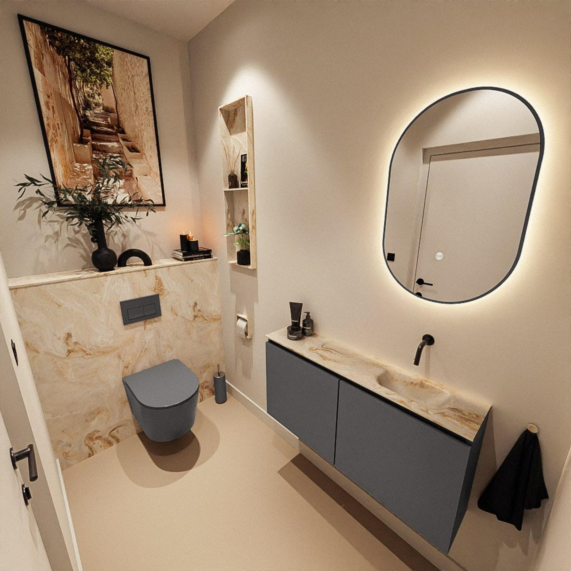 Avec une largeur de 100 cm et une profondeur de seulement 23 cm, vous exploitez au mieux le mur sans que le meuble ne dépasse trop dans la pièce. Cet ensemble est donc particulièrement adapté aux toilettes étroites, WC de couloir ou petites salles de bains où chaque centimètre compte. La teinte sombre Dark Grey offre un look contemporain et chic et se marie à merveille avec des carreaux clairs, un effet béton ou des tons bois chaleureux. La façade sans poignées crée un ensemble sobre et minimaliste : pas de poignées gênantes, mais des lignes épurées de mur à mur. Vous créez ainsi, avec peu d’éléments, une atmosphère d’hôtel de luxe, même dans un petit espace.
