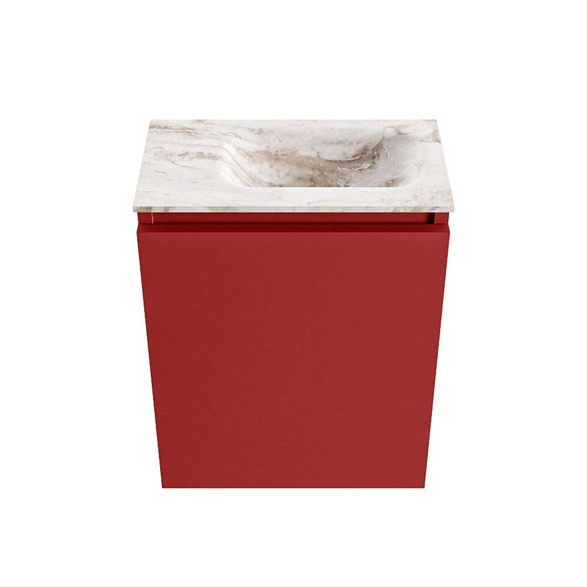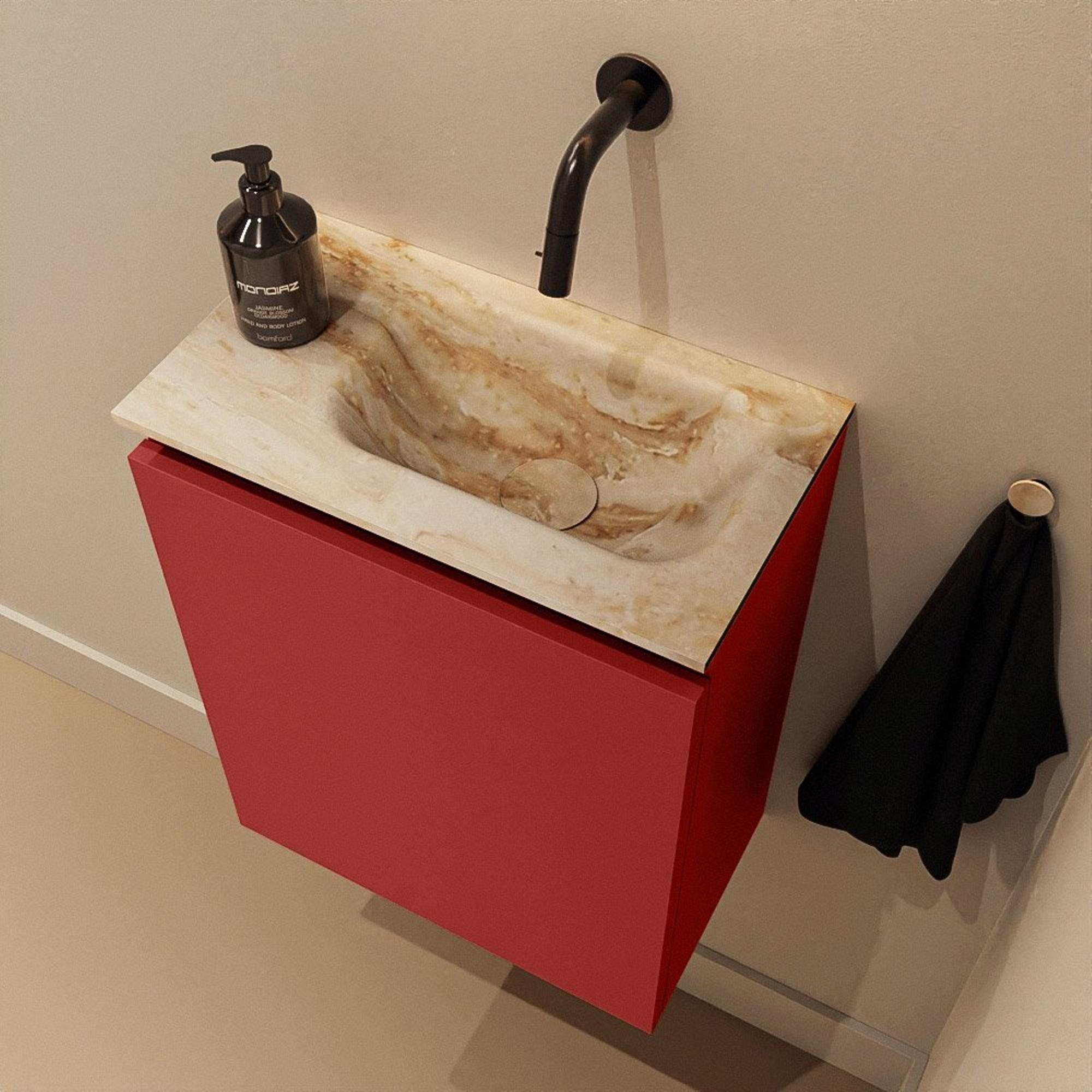Vous recherchez un meuble WC compact et moderne, à la fois pratique et véritable accroche-regard ? Alors cette combinaison avec un petit meuble fin et une vasque élégante est un choix malin, par exemple pour un espace WC, une petite salle de bains ou une salle de bains pour invités. Grâce à sa faible profondeur, le meuble s’intègre facilement dans les espaces étroits, tout en vous offrant un point d’eau à part entière. La teinte chaude, rouge du meuble se marie à merveille avec le plan de vasque beige doux à l’aspect marbre, ce qui ajoute immédiatement une ambiance luxueuse. Comme le robinet n’est pas placé sur la vasque, l’ensemble reste calme et minimaliste et vous pouvez choisir vous-même un robinet de lavabo compact et un siphon assortis à votre style.