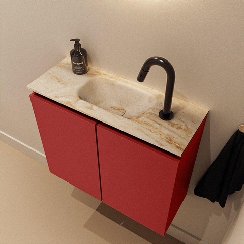 Vous cherchez un meuble élégant et pratique pour vos toilettes ou votre petite salle de bains, sans faire de compromis sur l’apparence et la qualité ? Ce meuble compact combine un design épuré avec un espace de rangement astucieux derrière deux portes, idéal pour les WC invités, les petites salles de bains étroites ou la niche où les meubles standards sont juste un peu trop profonds. La couleur rouge marquante du meuble forme un accent chaleureux dans un espace moderne et axé sur le design, tandis que le lavabo beige en couleur Frappe apporte de l’équilibre. Grâce à la profondeur limitée, vous conservez suffisamment d’espace de passage, tout en disposant d’un véritable point d’eau avec trou de robinet au centre. Parfait si vous recherchez une solution moderne et bien pensée, à la fois esthétique et agréable à utiliser au quotidien.