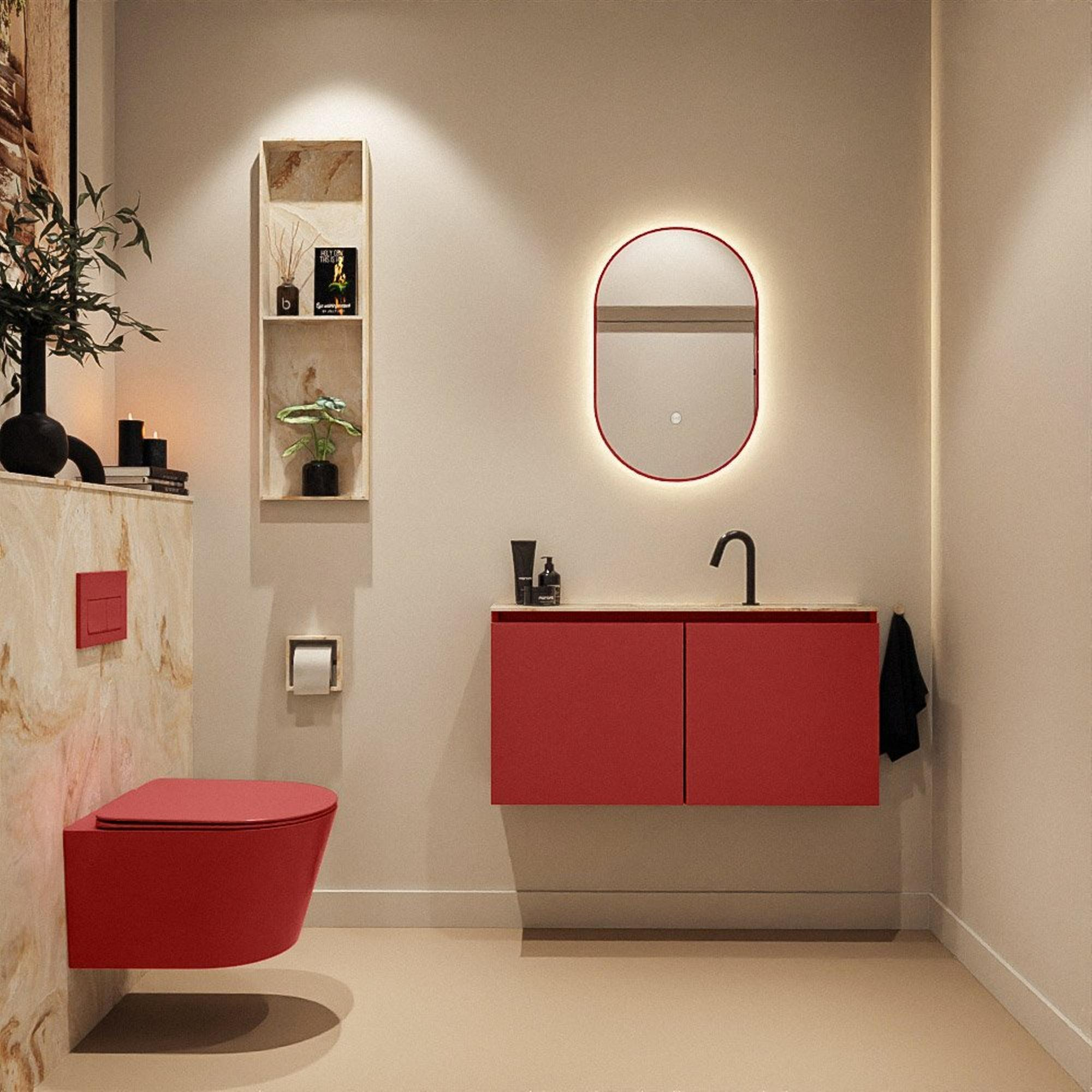 - Contraste élégant entre le meuble rouge et le lavabo beige Frappe en Solid Surface pour une apparence moderne et luxueuse.