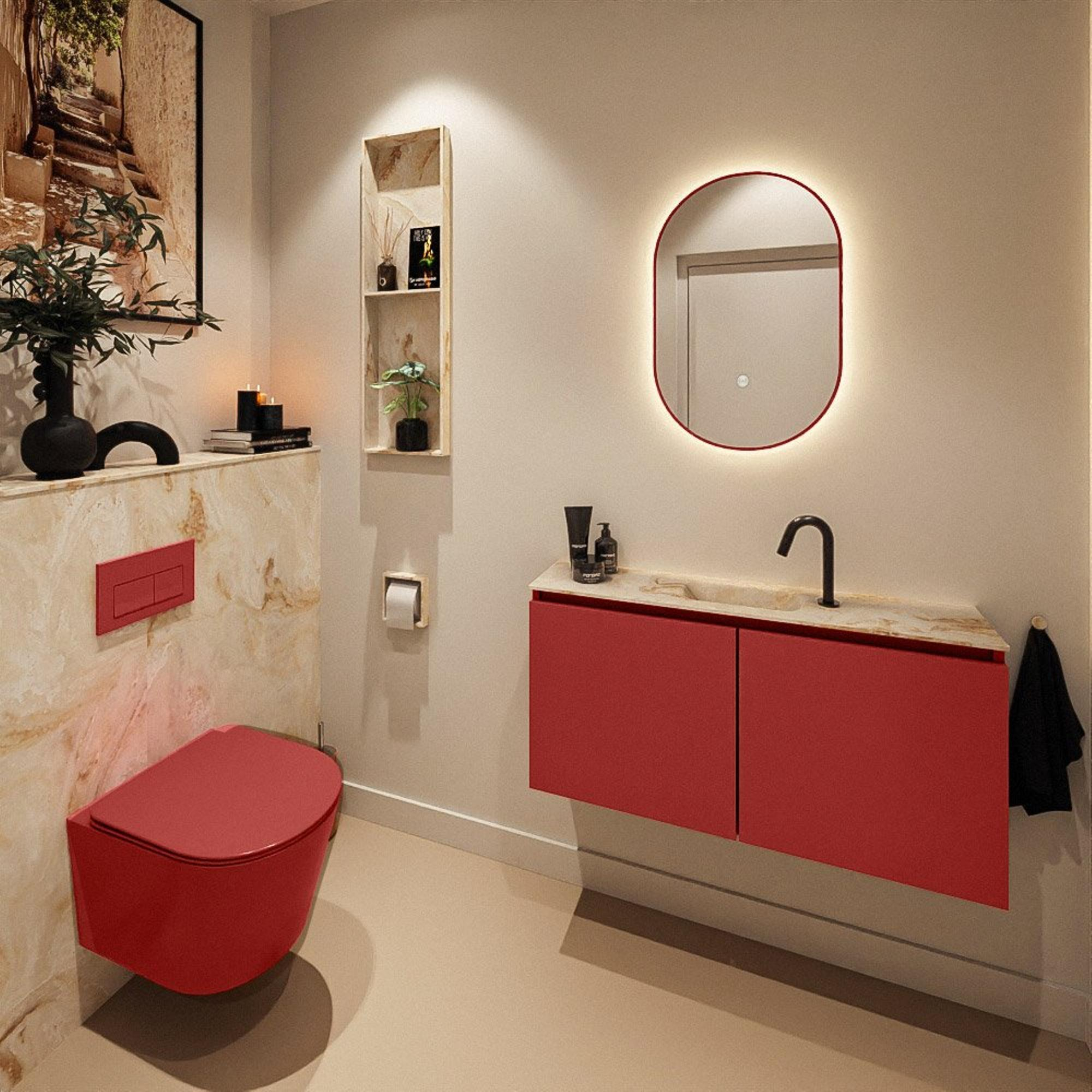 La couleur flamboyante du meuble constitue un puissant statement de design dans vos toilettes. Combinée à la teinte apaisante du lavabo en Solid Surface, elle crée un contraste dynamique mais néanmoins élégant. Avec une largeur de 100 cm et une profondeur de seulement 23 cm, l'ensemble paraît fin et léger, ce qui donne l'impression d'un espace plus grand, même dans une petite pièce. Les deux portes assurent une façade épurée sans interruption de tiroirs, ce qui renforce le caractère minimaliste. Grâce à la finition sans poignées, les lignes restent sobres et modernes, tout en vous permettant d'ouvrir le meuble confortablement. Ainsi, avec un encombrement relativement réduit, vous ajoutez un meuble qui devient immédiatement l'élément phare de vos toilettes ou de votre salle de bains compacte.