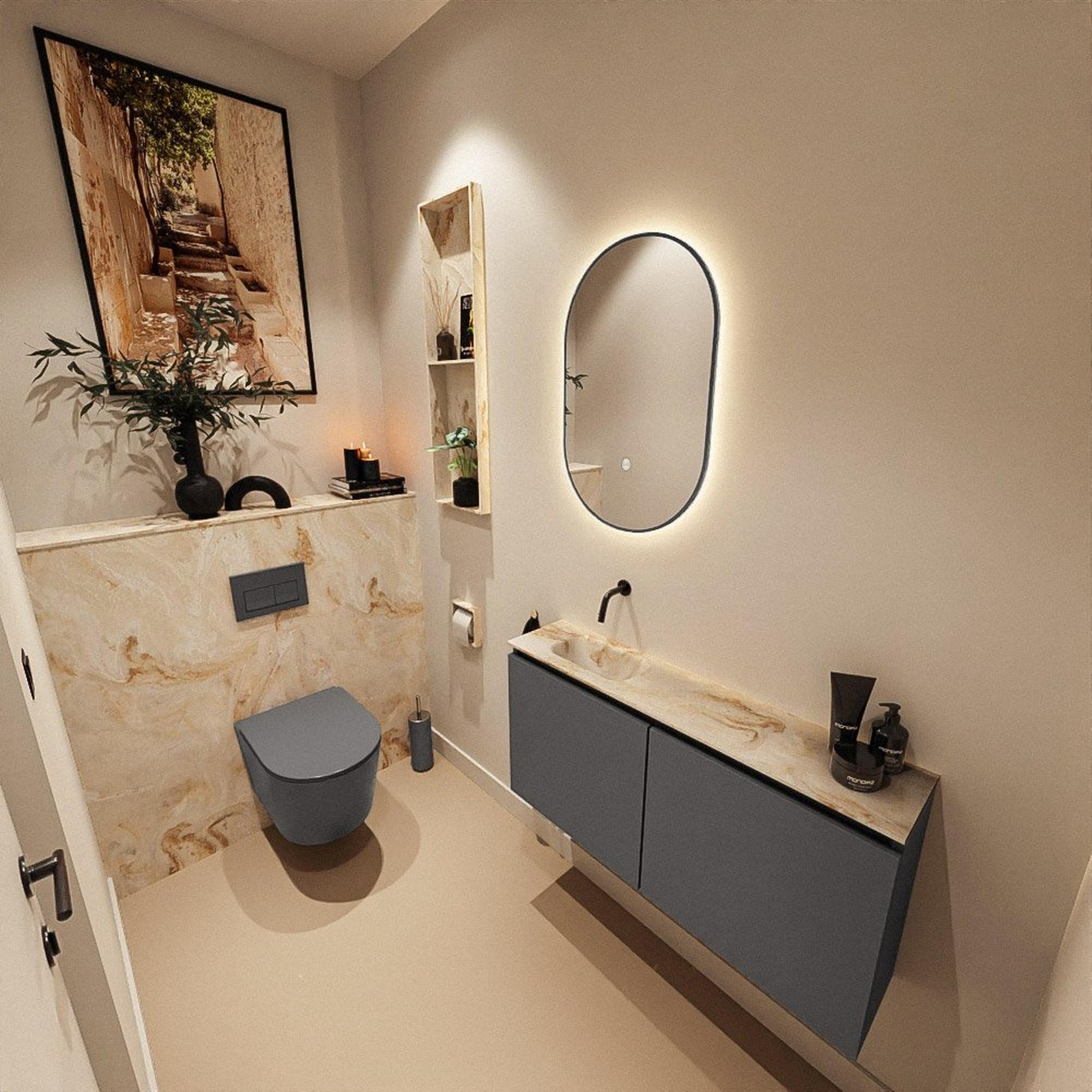 Ce meuble de toilettes compact est idéal si vous souhaitez créer un look élégant et moderne dans une petite salle de bains, un WC ou une niche étroite, sans faire de compromis sur le confort. Grâce à sa faible profondeur, il s’intègre facilement dans les espaces exigus, tout en vous offrant un lavabo complet et un espace de rangement pratique derrière des portes. La combinaison d’un meuble gris foncé avec un élégant lavabo en solid surface dans un ton Frappe doux crée une apparence apaisante et contemporaine qui s’harmonise parfaitement avec une grande variété de couleurs de carrelage et de styles de robinetterie. Comme la cuve est positionnée à gauche et qu’il n’y a pas de trou de robinet, vous disposez d’une grande liberté dans le choix et le positionnement d’un mitigeur surélevé ou d’un robinet mural. Vous créez ainsi très facilement une ambiance d’hôtel de luxe, même dans un WC compact.
