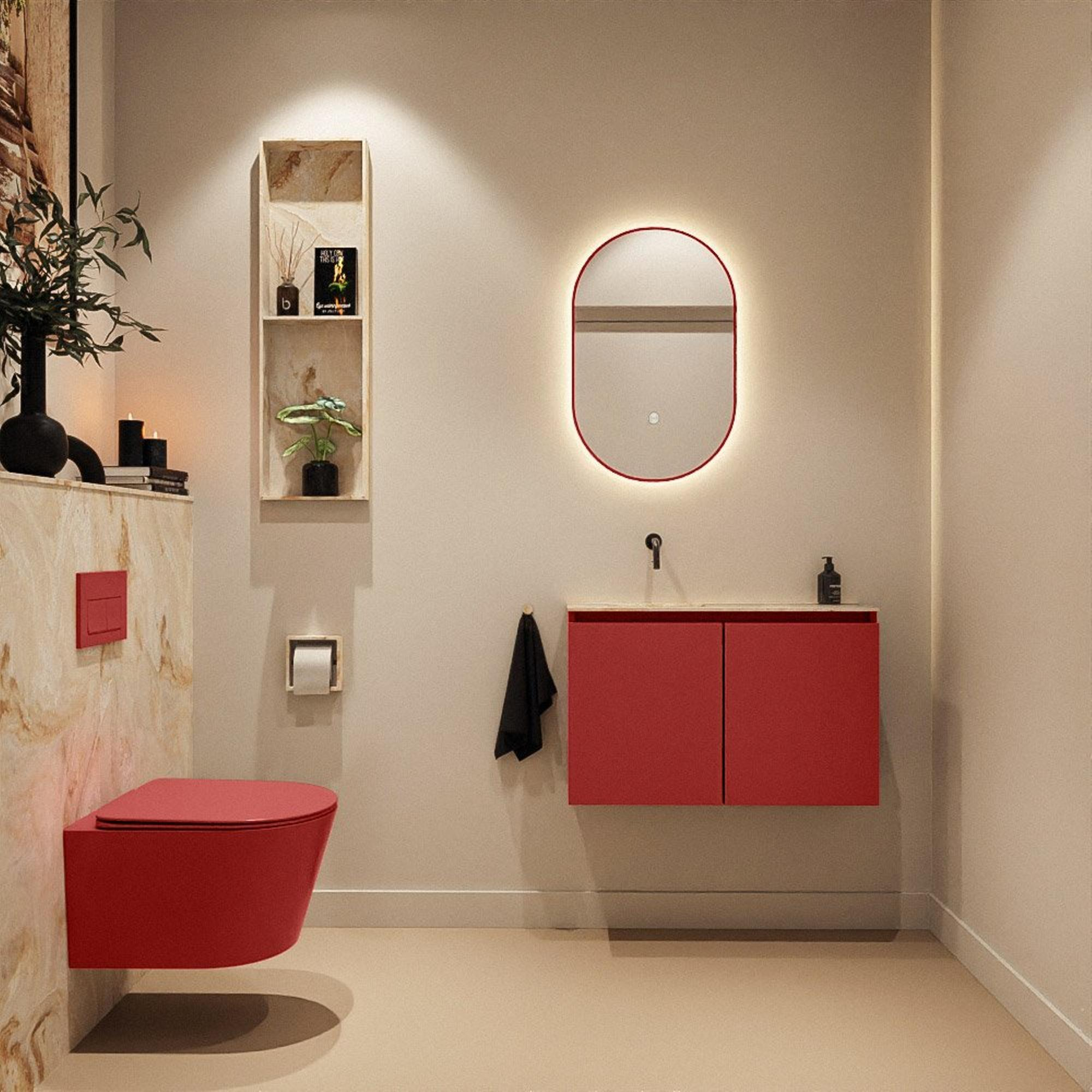 La chaude teinte rouge du meuble, associée au plan de vasque EDEN en solid surface couleur Frappe, confère une apparence contemporaine et chic. Cette combinaison de couleurs se marie parfaitement avec des matériaux naturels tels que des carreaux effet bois, un aspect béton ou des accents noir mat, mais forme également un contraste surprenant avec des murs blancs ou des structures marbrées claires. Grâce à la façade sans poignées, le meuble a une allure épurée et minimaliste, ce qui correspond aux salles de bains modernes et axées sur le design. L’aspect doux et mat du plan en solid surface renforce la sensation haut de gamme et fait de vos toilettes un espace que vous serez fier de montrer à vos invités.