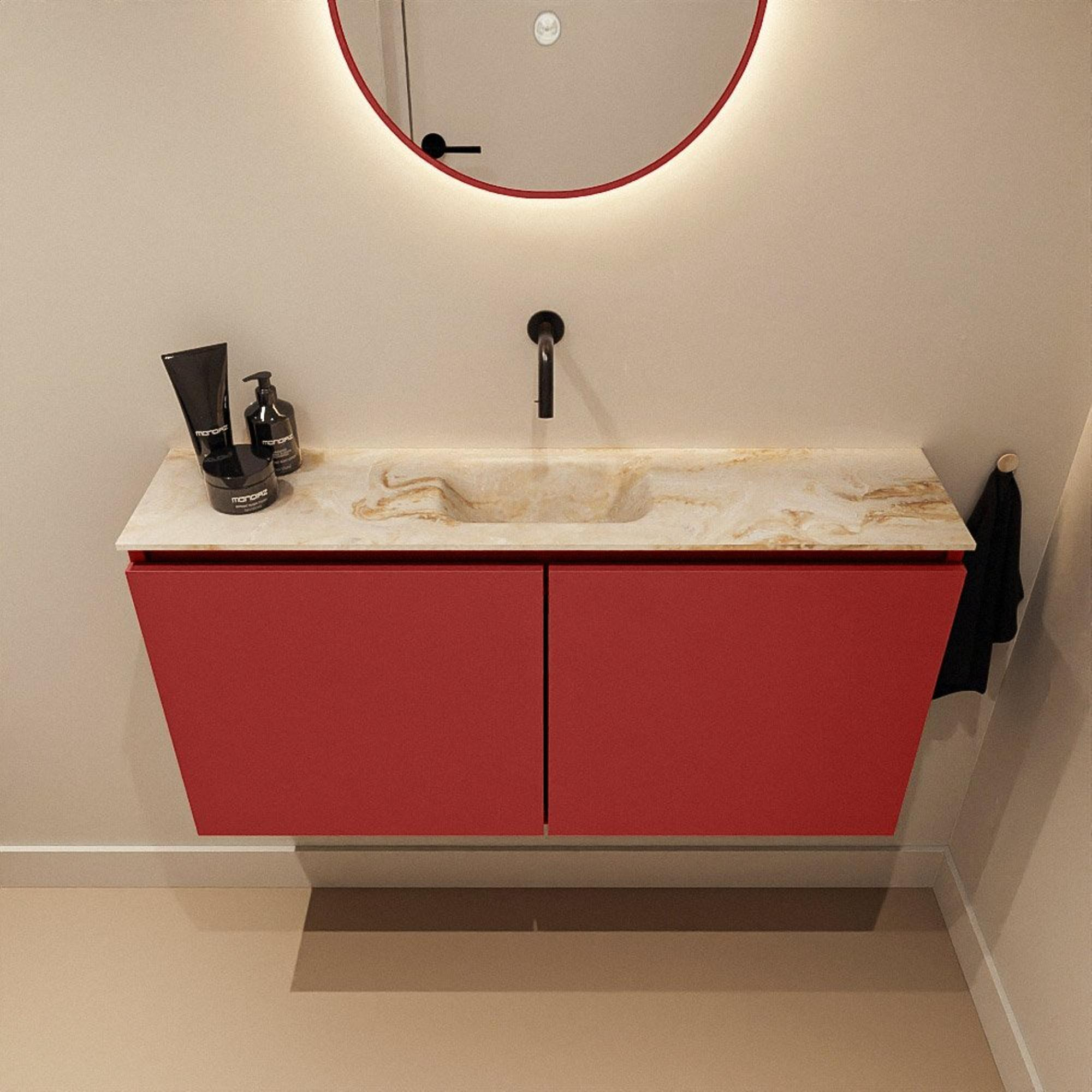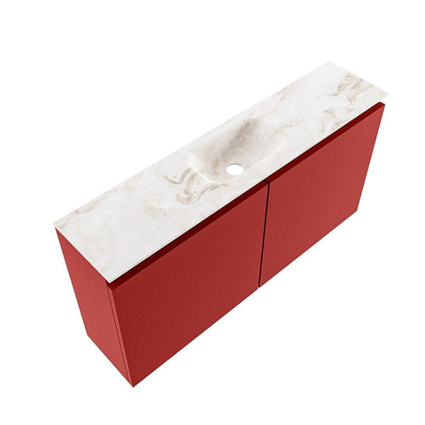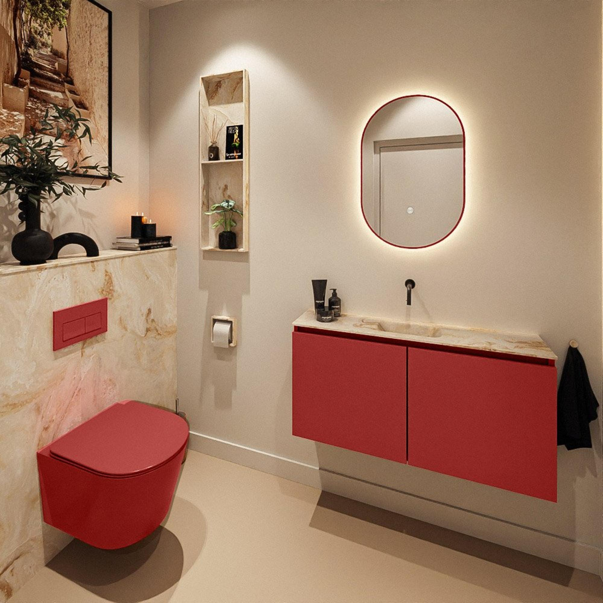 Avec ce meuble de toilettes compact, vous créez en un rien de temps une apparence luxueuse dans vos toilettes ou votre petite salle de bains, sans faire de concessions sur la fonctionnalité. La combinaison d’un meuble bas fin dans une teinte rouge chaleureuse et d’un lavabo épuré en solid surface beige rend l’ensemble idéal pour les intérieurs modernes et axés sur le design. Grâce à sa faible profondeur, ce meuble est particulièrement adapté aux espaces plus étroits, couloirs ou secondes toilettes où chaque centimètre compte, tout en offrant un point d’eau complet. La finition sans poignées assure un aspect calme et minimaliste et rend le meuble particulièrement facile à nettoyer. Le lavabo ne possède pas de trou de robinet, ce qui vous laisse toute liberté pour choisir un robinet surélevé ou mural élégant et ainsi accorder parfaitement l’apparence au reste de votre sanitaire.