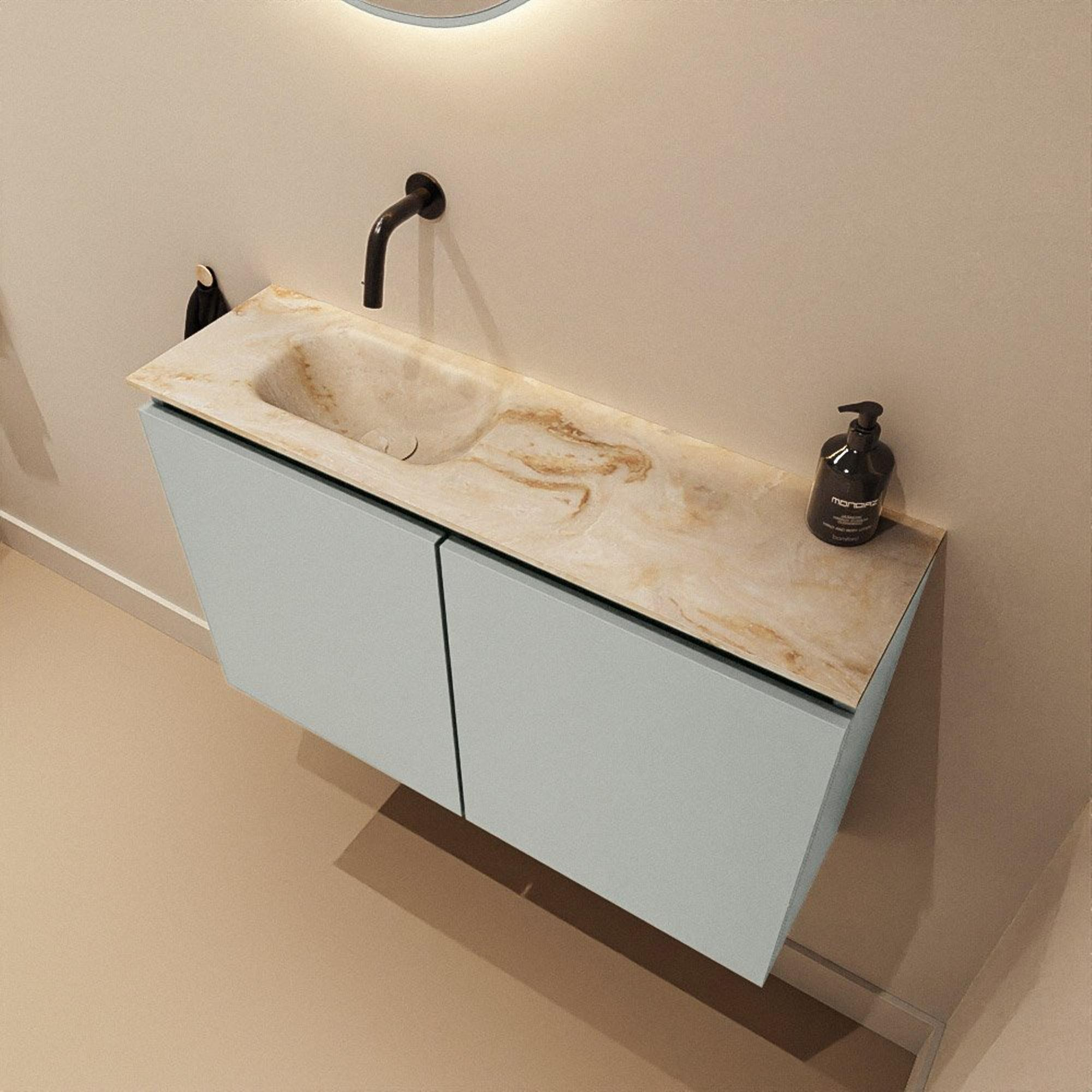 La couleur Greey du meuble forme une teinte gris doux et moderne qui se marie parfaitement avec une grande variété de styles de carrelage : du béton à la pose en chevrons effet bois. Le plan vasque Eden beige dans la teinte Frappe y ajoute une nuance chaleureuse et naturelle, de sorte que l’ensemble n’apparaît pas froid mais au contraire très chaleureux. Les façades sans poignées renforcent le look épuré et minimaliste et permettent au meuble de s’intégrer parfaitement dans une salle de bains de style moderne ou scandinave. Grâce à la combinaison ton sur ton apaisante, vous créez un ensemble intemporel qui ne se démode pas rapidement et se combine facilement avec des robinets et accessoires noirs, chromés ou en laiton brossé.