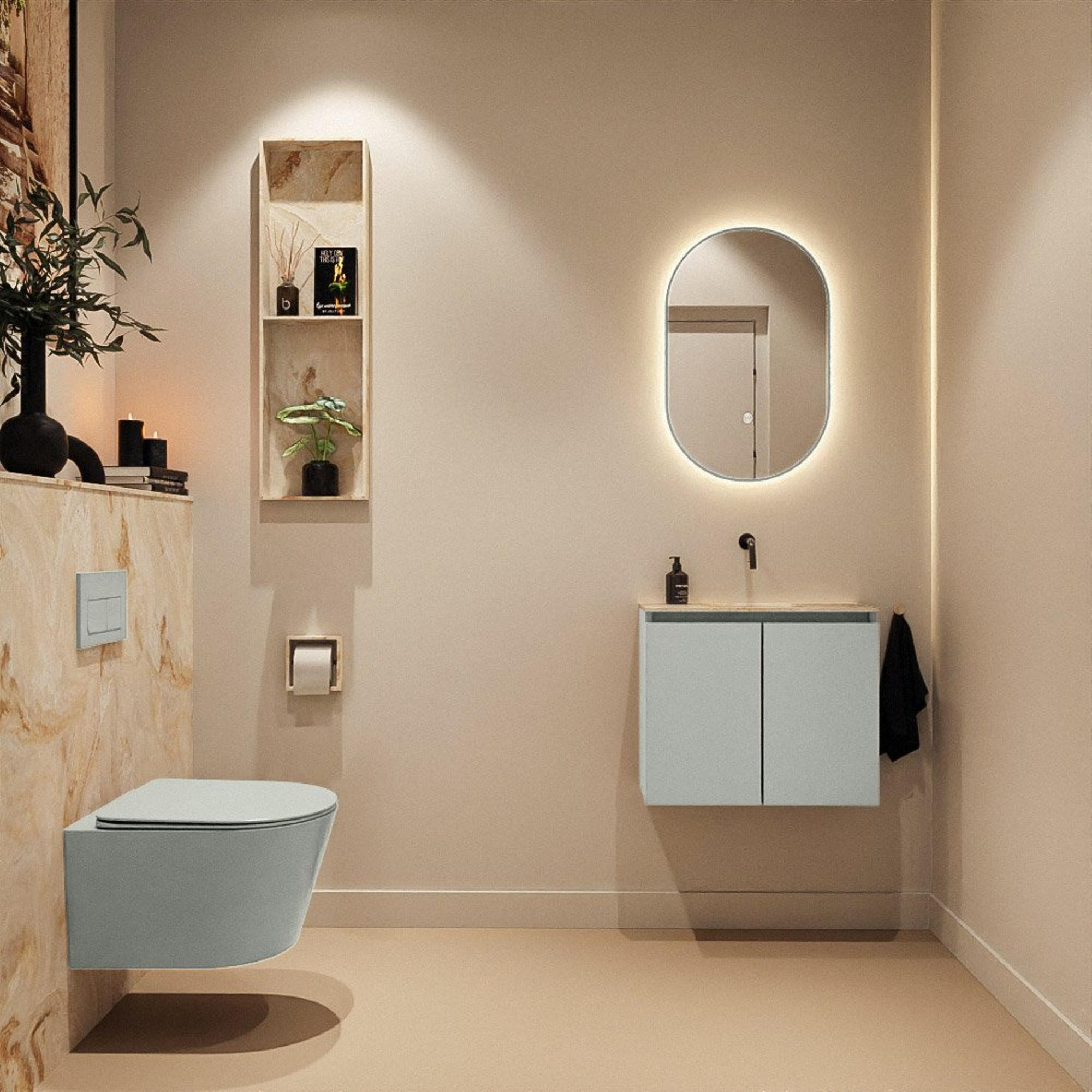 La douce couleur verte Greey du meuble associée au lavabo en solid surface mat Frappe confère une apparence moderne et chic. Ces teintes se marient très bien avec des matériaux naturels tels que des carreaux aspect bois, des sols aspect béton ou des murs blancs. Les façades sans poignées renforcent le look épuré et minimaliste et permettent au meuble de s'intégrer parfaitement dans une salle de bains moderne ou de style scandinave. Comme le lavabo est conçu sans trou de robinet, vous pouvez choisir vous-même un robinet mural ou un robinet sur le plan, ce qui vous offre une liberté de conception supplémentaire pour aménager vos toilettes exactement selon vos souhaits.