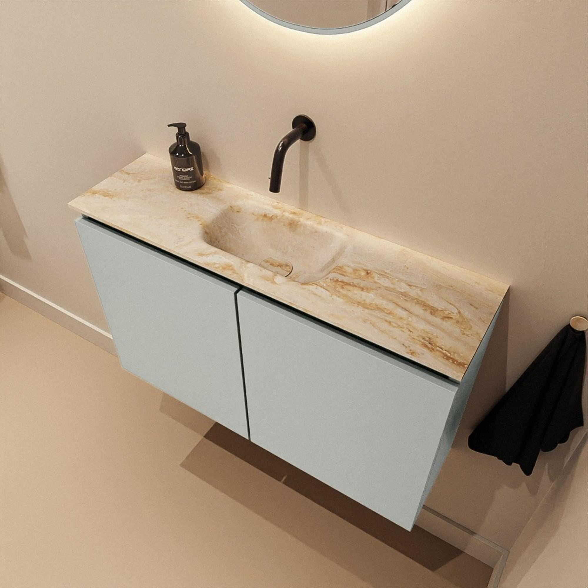- Lavabo Eden en beige Frappe, beau contraste doux avec le meuble.