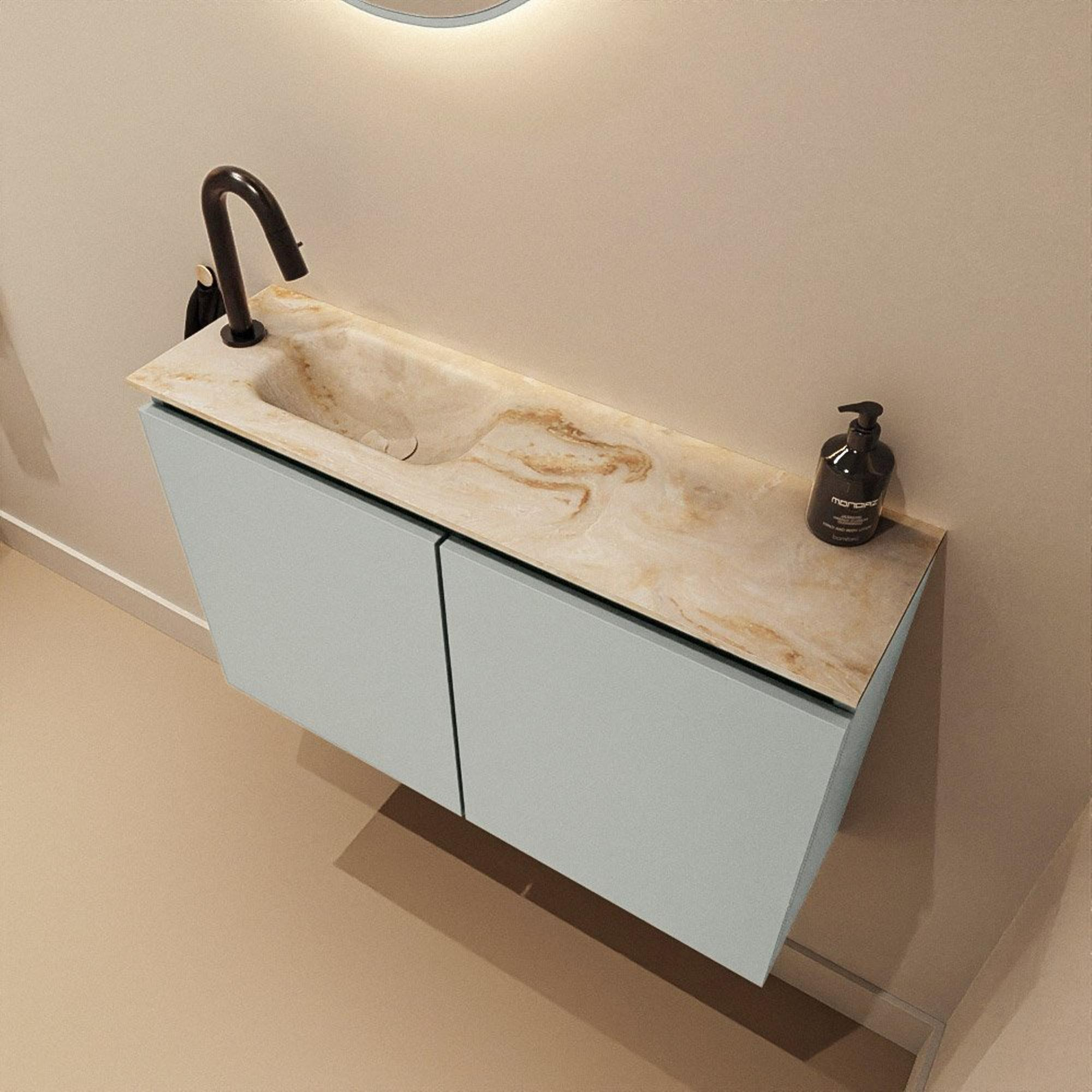 La couleur verte Greey du meuble forme une base belle et contemporaine qui s’accorde parfaitement avec les tons blancs, noirs et bois. Le plan de lavabo EDEN beige en finition Frappe y ajoute un aspect doux, façon pierre naturelle, donnant immédiatement à l’ensemble une allure haut de gamme. Cette combinaison de couleurs s’intègre parfaitement dans les salles de bains modernes et scandinaves, mais aussi dans les intérieurs industriels si vous la combinez avec des robinets et accessoires noirs. Comme la vasque est positionnée à gauche, il reste à droite une surface pratique pour poser du savon, un diffuseur de parfum ou des accessoires décoratifs qui donneront un caractère personnel à vos toilettes ou à votre salle de bains.