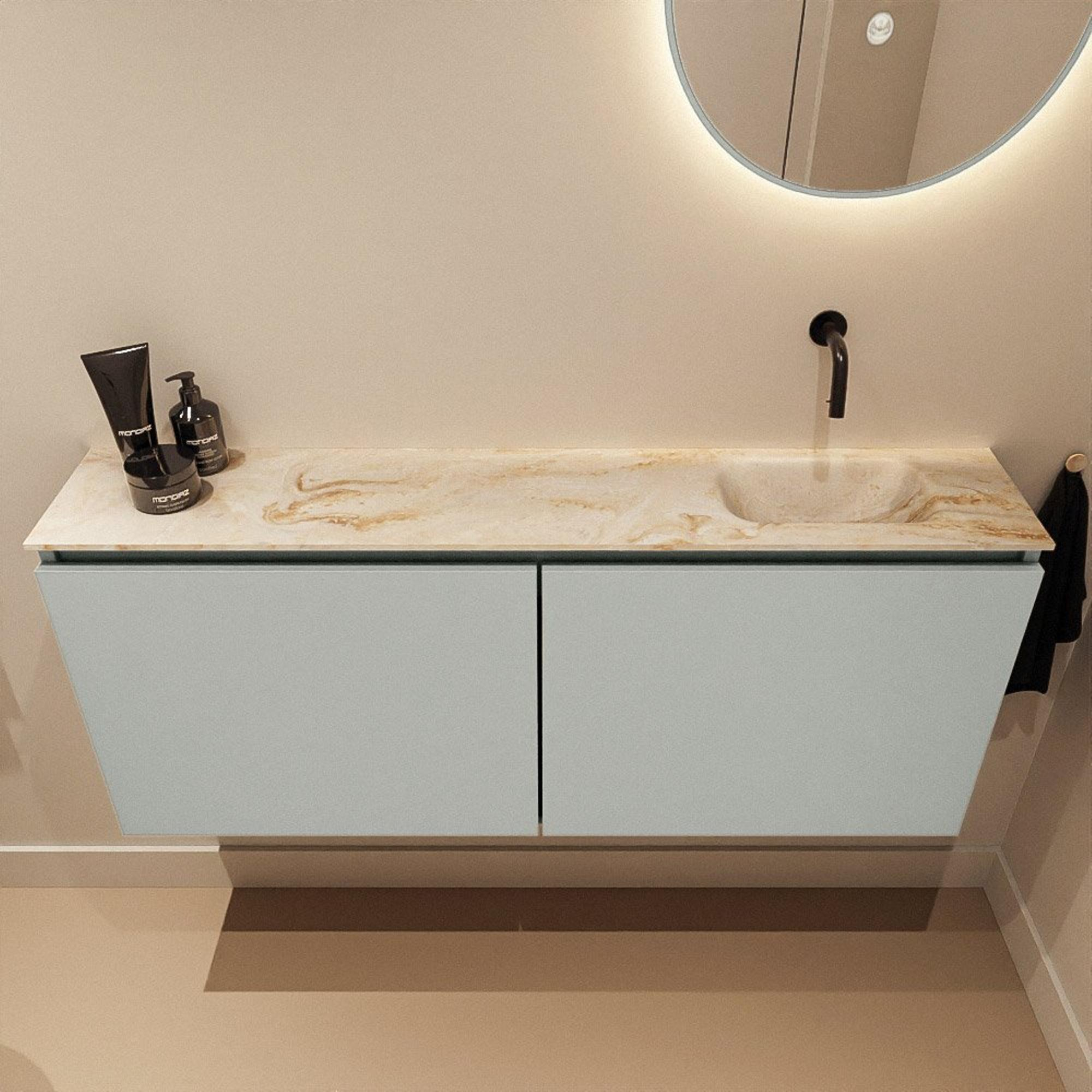 - Couleur de meuble Greey et lavabo beige EDEN Frappe pour un look moderne et apaisant.
