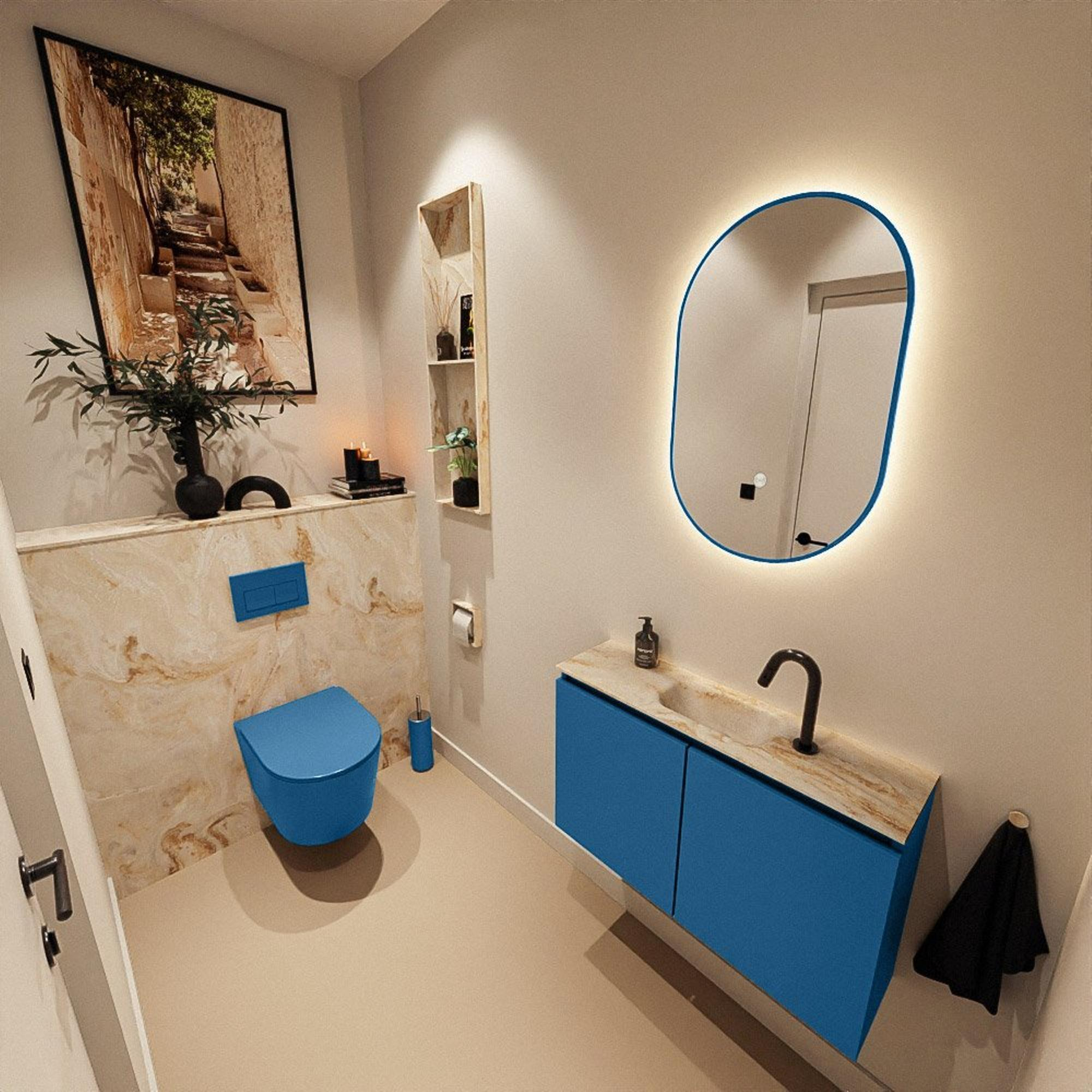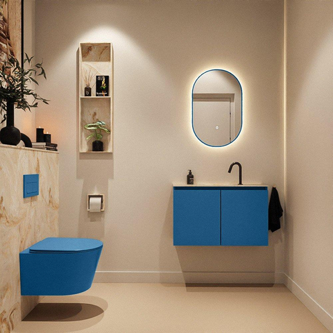 La couleur Jeans-bleu du meuble, combinée avec le lavabo Eden en Frappe (une teinte beige douce), offre un aspect contemporain et pourtant intemporel. Cette combinaison de couleurs se marie très bien avec des robinets et accessoires blancs ou noirs, mais se combine également à merveille avec des matériaux naturels tels que le bois ou des carreaux aspect béton. Le design moderne sans poignées crée une façade épurée sans interruptions, ce qui donne visuellement plus de calme et d’espace à votre mur et à votre sol. Cela rend le meuble particulièrement adapté si vous souhaitez créer une sensation de luxe dans vos toilettes, sans que l’ensemble paraisse chargé ou encombré.