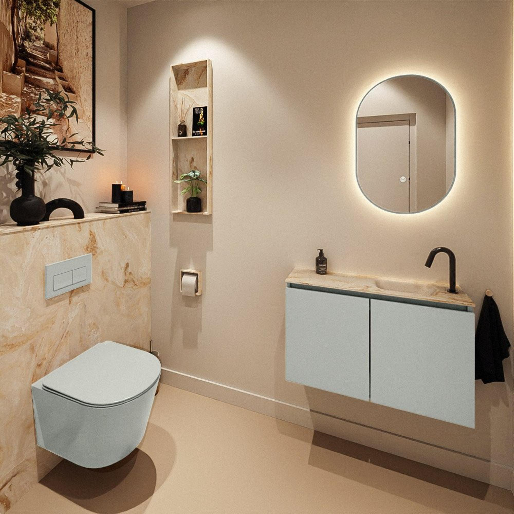 Vous recherchez un meuble élégant et peu encombrant pour vos toilettes ou votre petite salle de bains, qui soit non seulement esthétique mais aussi pratique à utiliser au quotidien ? Cette combinaison compacte de meuble et de lavabo est spécialement conçue pour les petits espaces tels qu’un WC, une salle de bains étroite ou une salle de bains pour invités, où chaque centimètre compte tout en conservant confort et esthétique. Grâce à la faible profondeur, vous disposez d’un espace de mouvement suffisant, tout en ayant un véritable espace de lavage avec robinet et surface de dépose. L’association de couleurs modernes avec un lavabo chaleureux à l’aspect minéral rend ce meuble parfaitement adapté à un style contemporain, minimaliste ou hôtel chic. Vous créez ainsi une apparence ordonnée et luxueuse, même dans le plus petit des espaces.