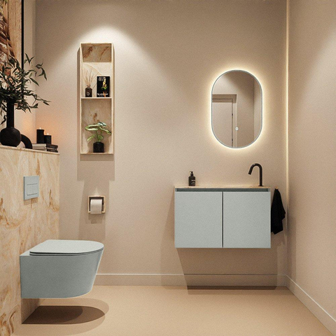 Avec une largeur de 80 cm et une profondeur de seulement 23 cm, ce meuble est parfait dans les situations où vous disposez de peu d’espace, mais ne voulez pas faire de compromis sur l’apparence et la facilité d’utilisation. La faible profondeur évite que le meuble ne s’avance trop dans la pièce, ce qui permet de circuler facilement et de ne pas gêner le mouvement de la porte. Grâce au positionnement du lavabo à droite, l’ensemble s’adapte également bien le long d’un mur où, par exemple, la porte pivote à gauche ou lorsque vous avez besoin de plus d’espace de mouvement à droite du lavabo. Vous optez ainsi consciemment pour un meuble de toilettes bien pensé, agréable à utiliser au quotidien et qui donne en même temps une impression visuelle d’espace plus grand.