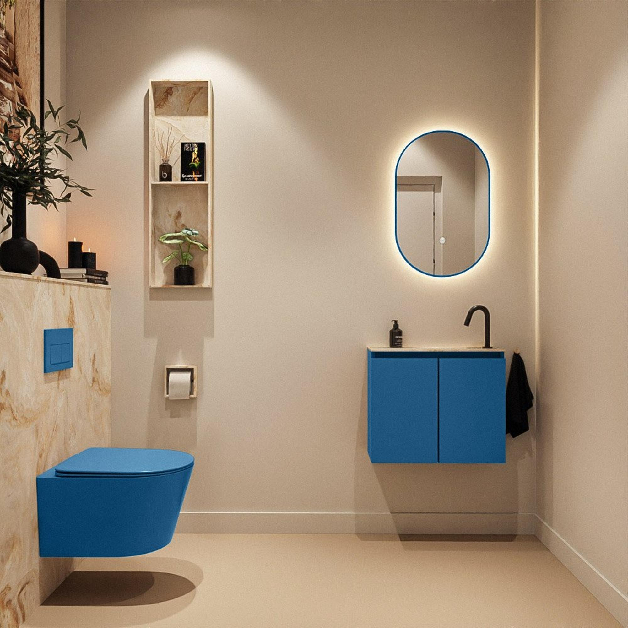 La combinaison de la couleur jeans moderne du meuble et du lavabo Eden en Frappe (une teinte beige chaleureuse) apporte une subtile ambiance d’hôtel à vos toilettes ou à votre salle de bains. Le bleu du meuble est audacieux et contemporain, tandis que le lavabo beige semble justement chaleureux et doux. Ensemble, ils forment un ensemble élégant qui s’intègre parfaitement dans un style de salle de bains moderne, scandinave ou industriel. Les façades sans poignées renforcent le look épuré et assurent une apparence calme et minimaliste. Associez par exemple ce meuble à un robinet noir ou en métal brossé, à un miroir rond et à quelques accessoires en matériaux naturels, et vous créez avec peu d’éléments une allure luxueuse.