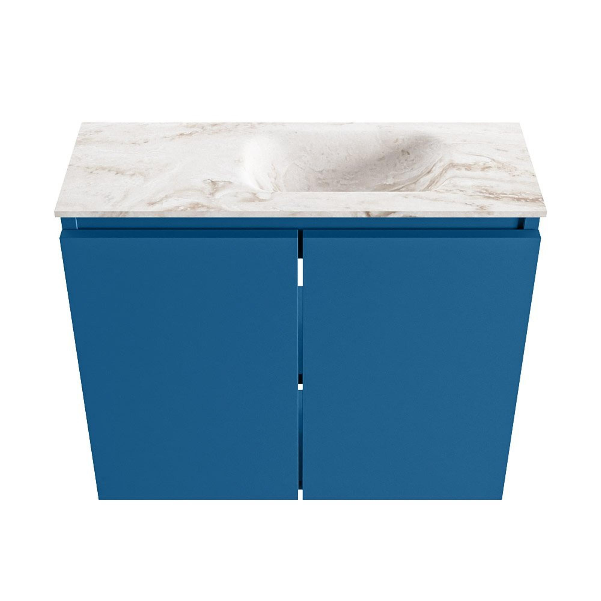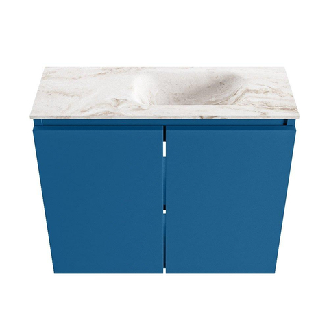 Si vous recherchez un meuble compact mais élégant pour vos toilettes ou votre petite salle de bains, cette combinaison est un choix judicieux. Grâce à sa faible profondeur, il s’intègre facilement dans un espace étroit, sans que vous deviez renoncer au confort d’utilisation. La couleur de meuble bleue et apaisante forme un beau contraste avec le plan de vasque beige, ce qui crée immédiatement une ambiance moderne et chaleureuse. Cet ensemble convient particulièrement pour des toilettes d’invités, une deuxième salle de bains ou une niche étroite où chaque centimètre compte. Grâce aux lignes droites et à la finition sans poignées, l’ensemble paraît épuré et ordonné, tandis que le plateau solide et l’agencement bien pensé vous permettent de vous laver les mains confortablement au quotidien et de ranger proprement les petits accessoires de toilette.