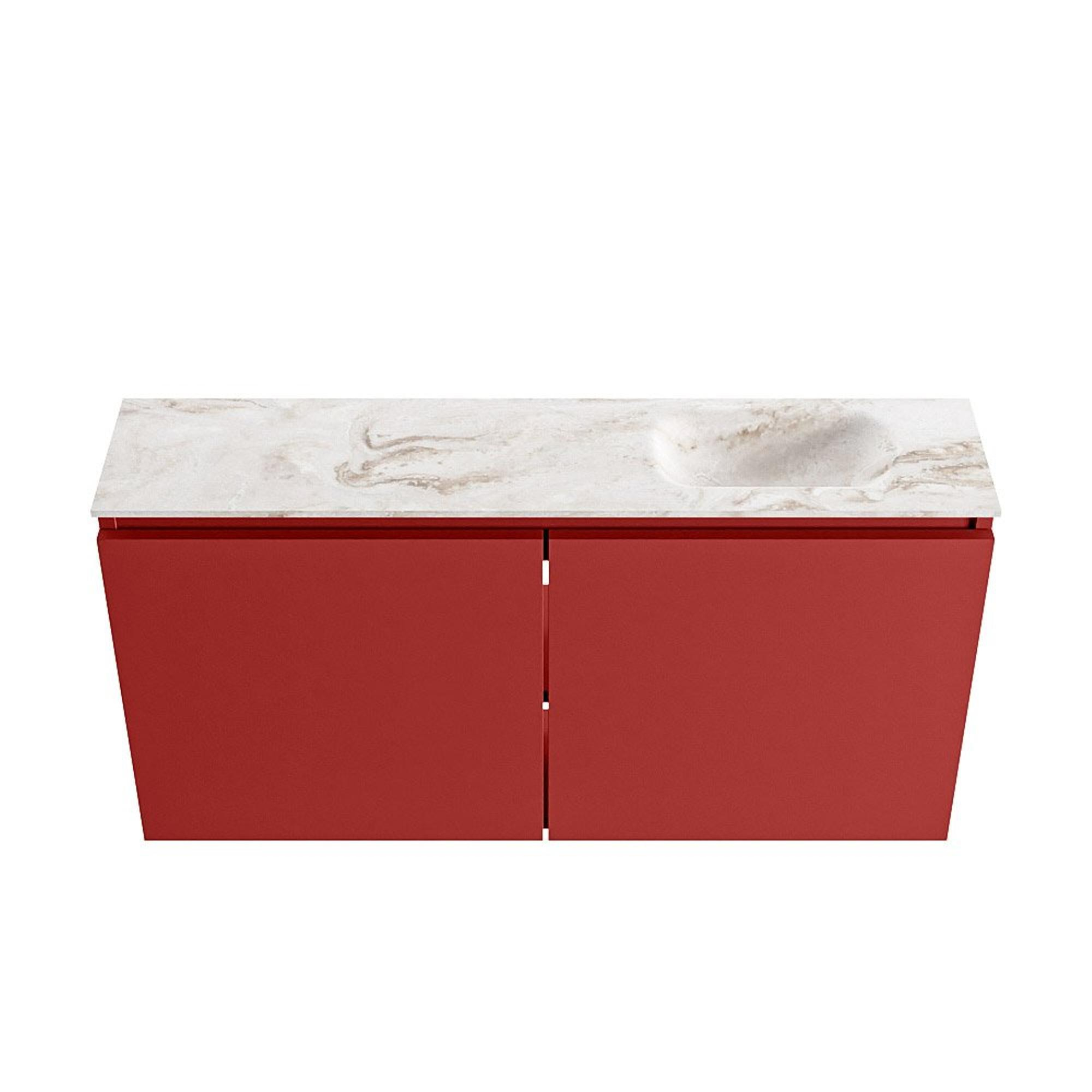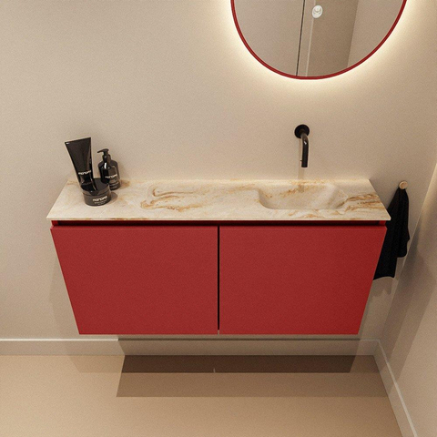 - Couleur du meuble Fire (teinte rouge) combinée à un lavabo en Solid Surface beige dans la couleur Frappe.