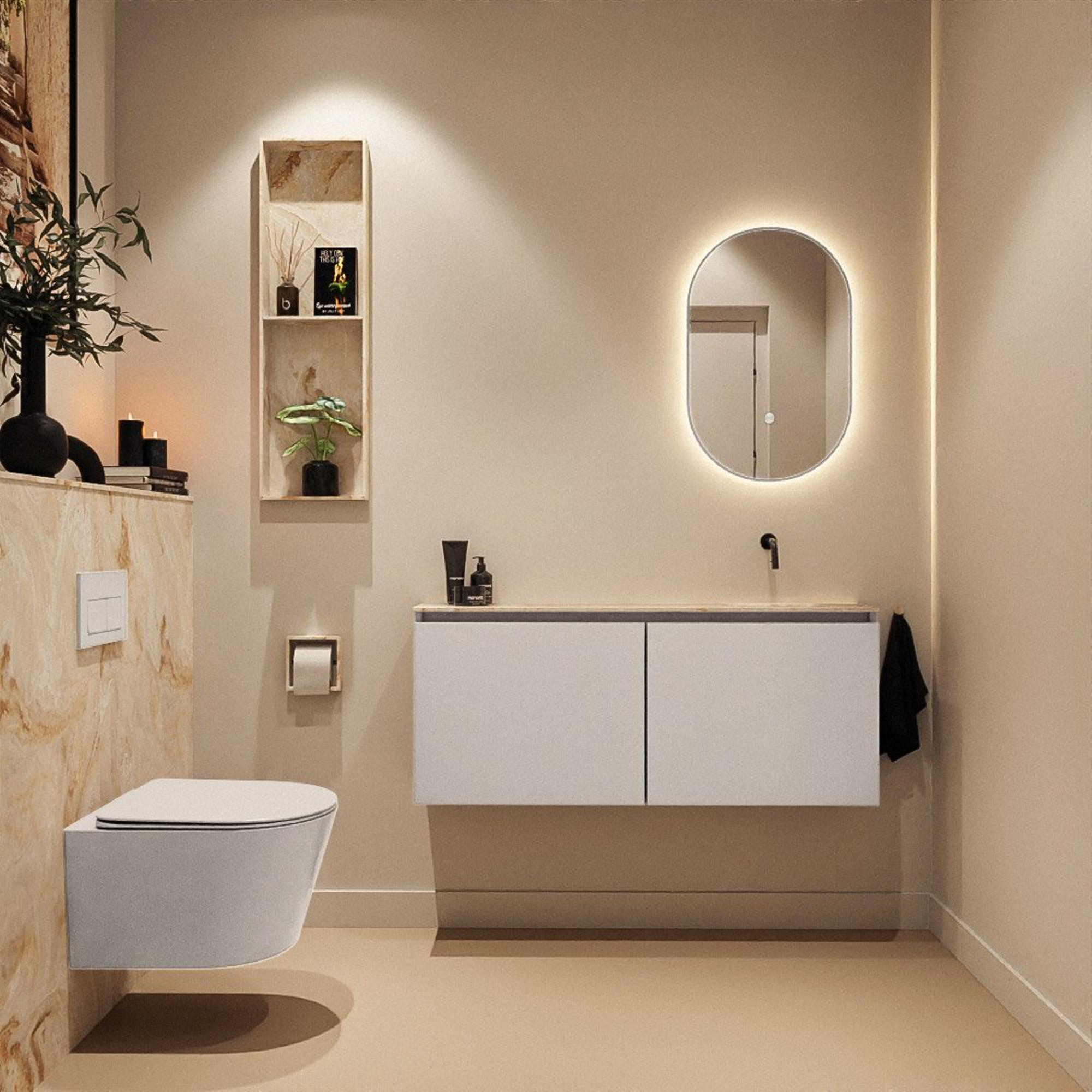 La couleur lin du meuble se marie à merveille avec le lavabo Eden dans la teinte Frappe, une nuance beige douce à la fois chaleureuse et raffinée. Cette subtile combinaison ton sur ton s’accorde facilement avec des carreaux clairs, du bois naturel et des accents noirs ou en métal brossé. Si vous choisissez un beau robinet mural au-dessus du lavabo, vous obtenez un look sobre et luxueux que l’on retrouve habituellement uniquement dans les hôtels design. Le jeu de lignes moderne et épuré, sans poignées visibles, s’intègre parfaitement à un style d’intérieur contemporain. En même temps, la palette de couleurs est intemporelle, ce qui vous permet de combiner facilement le meuble avec différents accessoires et styles, maintenant et dans quelques années.