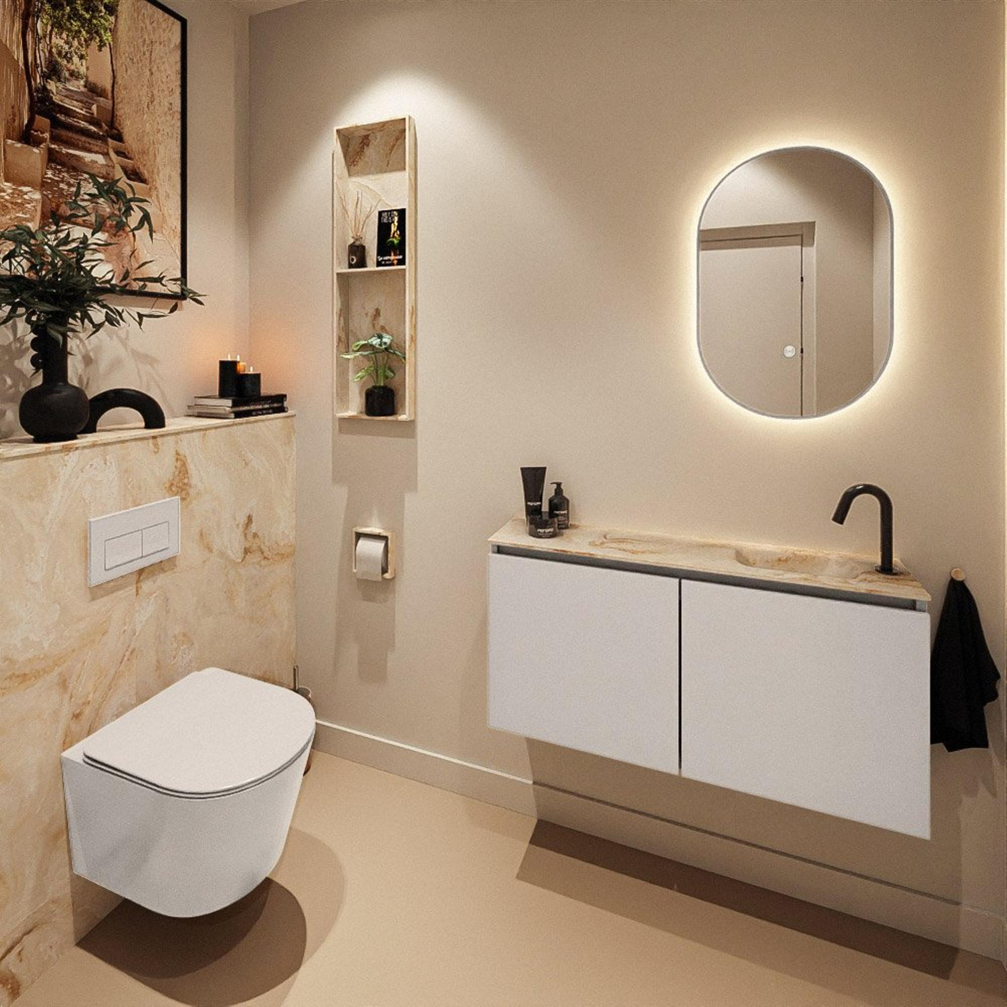 Vous recherchez un meuble de WC extra peu profond et élégant qui prend peu de place tout en offrant une allure luxueuse ? Ce meuble compact est conçu pour les toilettes et les petites salles de bains où chaque centimètre compte, sans que vous deviez renoncer à l’esthétique. La combinaison du meuble de couleur lin chaleureuse et du lavabo beige élégant crée un look moderne et doux qui s’intègre parfaitement aussi bien dans les intérieurs scandinaves apaisants que dans les salles de bains épurées et minimalistes. Grâce à la largeur de 100 cm, vous disposez d’une généreuse surface de dépose pour le savon et les accessoires, tandis que la faible profondeur gêne à peine le passage. Idéal si vous avez un espace étroit, si vous souhaitez revaloriser un WC invité ou si vous recherchez simplement une solution raffinée et contemporaine, à la fois pratique et esthétique au quotidien.
