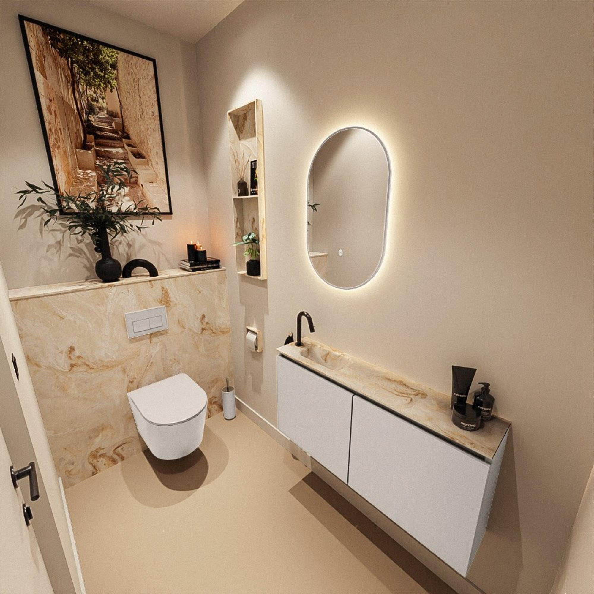 Le meuble est fabriqué en MDF, un matériau de mobilier largement utilisé et fiable qui garantit des façades lisses et uniformes et un aspect moderne. Le plan de lavabo en solid surface est agréable au toucher, affiche un style épuré et se nettoie facilement en cas d’utilisation normale. Grâce au lavabo Eden intégré avec un trou de robinet, vous disposez immédiatement d’une base adaptée pour un petit mitigeur de lavabo. Les deux portes du meuble offrent un espace de rangement pratique pour tout ce que vous préférez garder hors de vue, afin que vos toilettes paraissent toujours nettes et bien ordonnées. La finition sans poignées crée en outre une apparence épurée et permet de combiner facilement le meuble avec un miroir minimaliste ou une simple étagère au-dessus. Vous profitez ainsi chaque jour d’une solution à la fois fonctionnelle et élégante.