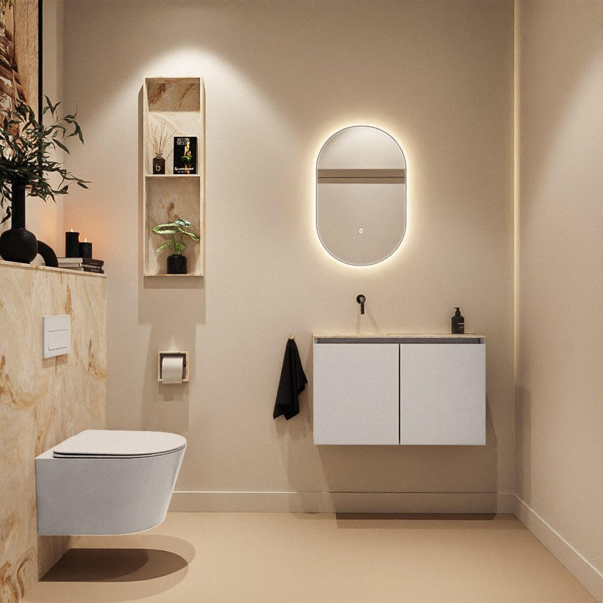 Le caisson de couleur lin et le lavabo Eden dans la teinte Frappe forment ensemble une combinaison moderne mais chaleureuse. Le meuble en MDF présente une texture subtile et une teinte douce, ce qui le rend facile à associer avec des carreaux muraux blancs, un effet béton, des accents bois ou au contraire des accessoires sombres. Le lavabo en solid surface et le plan de lavabo beige s'emboîtent parfaitement, ce qui crée un aspect luxueux et presque sans joint. Comme aucun trou de robinet n'est prévu, vous pouvez opter pour un robinet surélevé assorti sortant du mur ou installé sur une tablette séparée, idéal si vous envisagez un robinet minimaliste ou design. Vous adaptez ainsi l'ensemble précisément au style de votre salle de bains.
