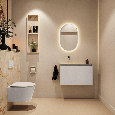 Les façades sans poignées et les portes à fermeture douce garantissent que le meuble n'est pas seulement esthétique, mais également agréable à utiliser. Les portes se ferment en douceur et sans bruit, ce qui est non seulement appréciable dans un petit espace, mais contribue aussi à prolonger la durée de vie du meuble. Derrière les deux portes, vous rangez facilement du papier toilette, des produits d'entretien ou des serviettes invité, afin que votre espace WC reste toujours propre et ordonné. Le lavabo en solid surface est naturellement lisse et uniforme, ce qui empêche la saleté d'adhérer facilement et vous permet de le nettoyer rapidement avec un chiffon doux et un produit d'entretien léger. Le fait que l'ensemble soit doté d'un traitement antibactérien est une idée rassurante dans un espace sanitaire où l'hygiène est importante.