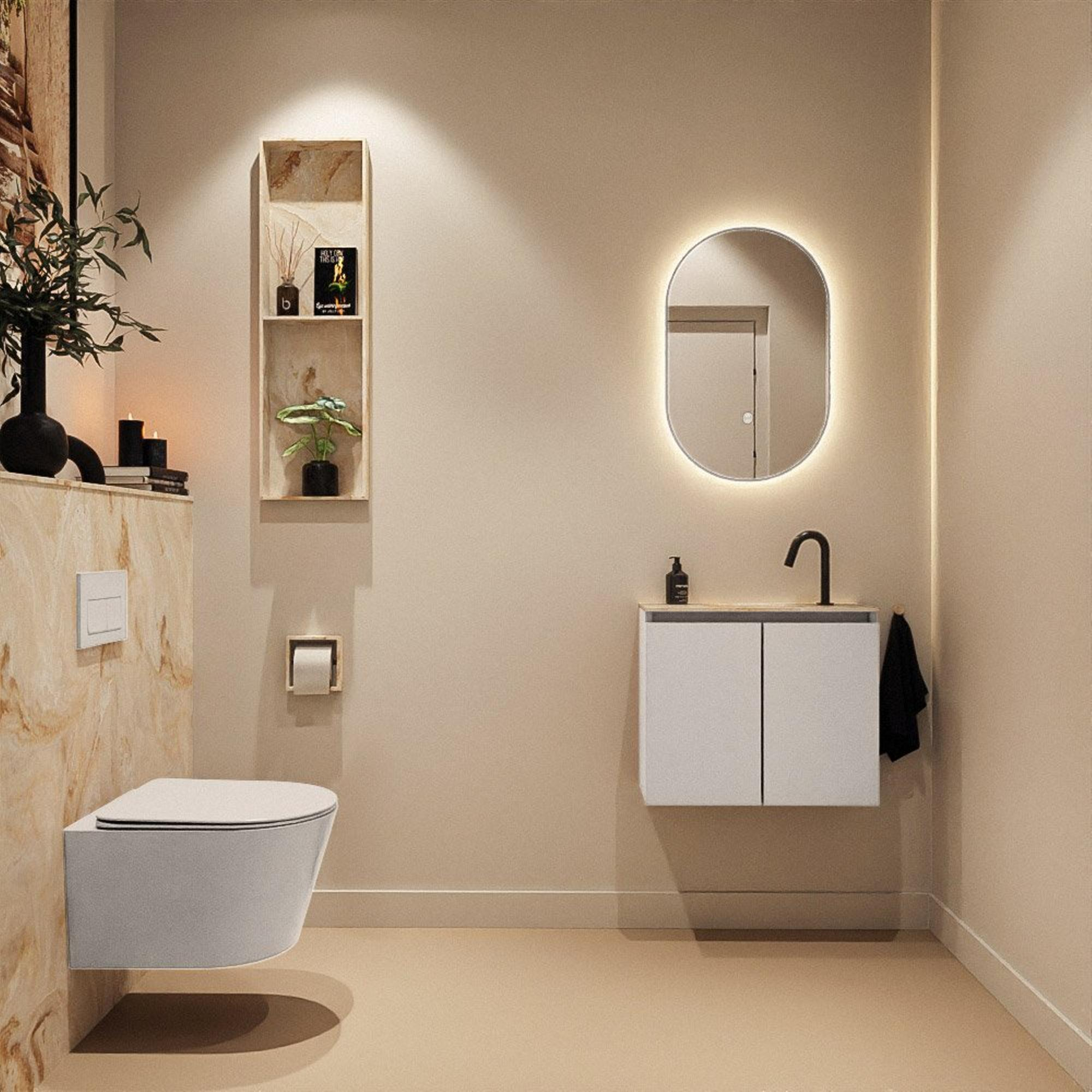 La combinaison d’un meuble en MDF de couleur Linen avec un lavabo en Solid Surface dans la teinte Frappe crée un look calme et moderne avec une touche de chaleur. Le MDF est un matériau très souvent choisi pour les meubles de salle de bains en raison de sa finition nette et de sa stabilité dimensionnelle, tandis que le Solid Surface est réputé pour son aspect uniforme, mat et luxueux. Le lavabo beige s’intègre parfaitement aux styles naturels et scandinaves, mais est également du plus bel effet dans des toilettes modernes et minimalistes. Grâce aux façades sans poignées, l’ensemble paraît encore plus épuré et intemporel, ce qui fait que votre intérieur restera contemporain même dans quelques années.