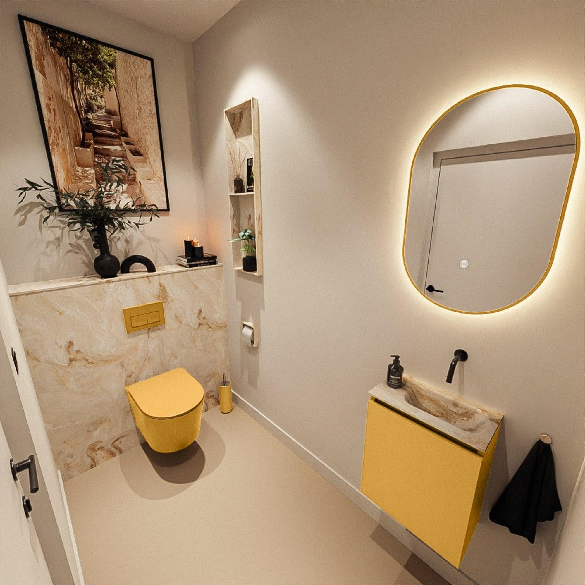 La combinaison du meuble ocre et du lavabo Eden beige dans la couleur Frappe donne immédiatement à vos toilettes une apparence design. Le Ocher chaleureux forme un accent fort, tandis que le lavabo doux et clair équilibre l'ensemble et évoque une ambiance luxueuse. Cette combinaison de couleurs se prête parfaitement aux salles de bains modernes, scandinaves ou d'esprit hôtel chic, mais peut également fonctionner à merveille comme accent de couleur dans un espace par ailleurs calme, blanc ou gris. En optant pour un mélange aussi affirmé que intemporel, vous donnez une touche personnelle à vos toilettes, sans que cela ne se démode rapidement. Associez l'ensemble à des accessoires noirs, laiton ou chromés pour un intérieur complet et bien pensé.