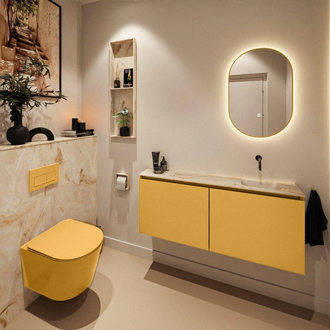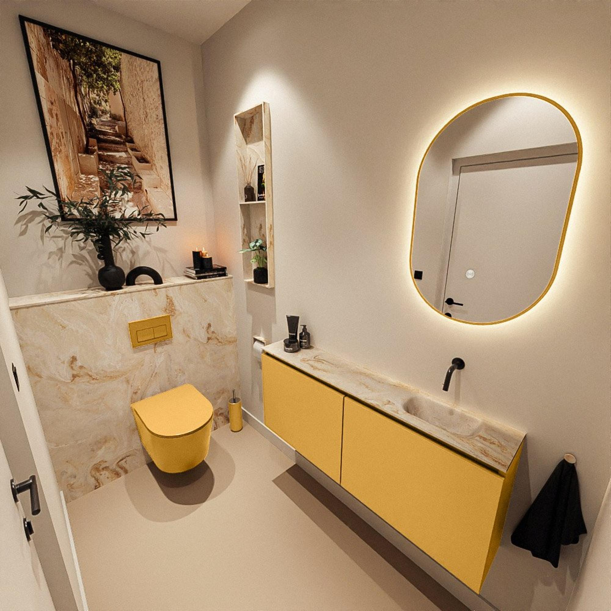 Avec une largeur de 120 cm et une faible profondeur de 23 cm, ce meuble offre un jeu de lignes horizontal et élancé qui s’intègre parfaitement dans les intérieurs modernes. La couleur ocre apporte chaleur et caractère sans être criarde, ce qui permet de l’associer facilement avec des carreaux neutres, des robinets noirs ou laiton et divers accessoires. Les façades sans poignées créent une apparence épurée et calme le long du mur, ce qui donne à votre espace WC une impression de grandeur. Le lavabo en Frappe – une teinte beige/crème douce – ajoute un accent subtilement luxueux, comparable à la pierre naturelle mais avec un aspect plus net et uniforme. Ainsi, vous créez avec un seul meuble une déclaration de style claire, sans que votre pièce paraisse surchargée.