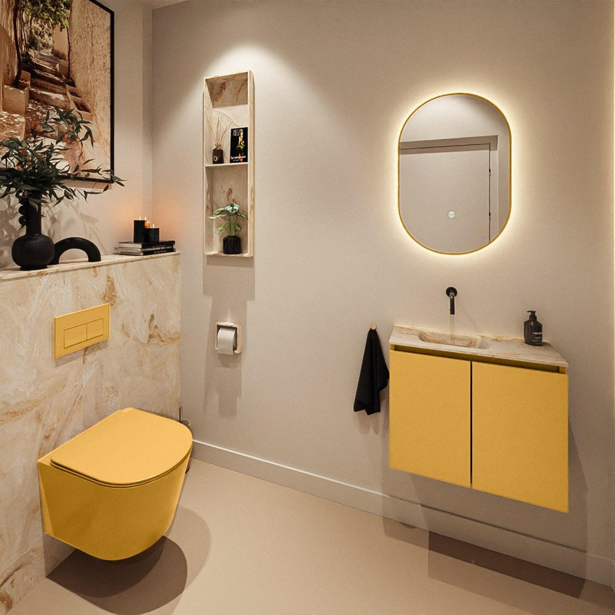 La combinaison du meuble bas couleur ocre et du lavabo EDEN beige en Frappe crée une ambiance chaleureuse et moderne. L’ocre ajoute une touche de couleur subtile sans être criard, ce qui donne immédiatement plus de personnalité à vos toilettes. L’aspect mat du plan en solid surface confère un look luxueux et design qui se marie parfaitement avec des robinets et accessoires noirs, couleur chrome ou en métal brossé. Grâce à son design sans détails superflus, ce meuble s’intègre bien dans les salles de bains modernes et minimalistes, mais aussi dans des styles scandinaves ou d’inspiration hôtel chic. Associez-le à un miroir rond, un éclairage discret et une belle serviette pour créer en une seule fois un ensemble complet et harmonieux.