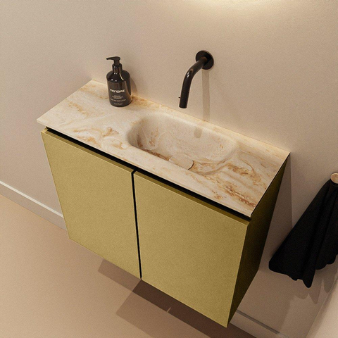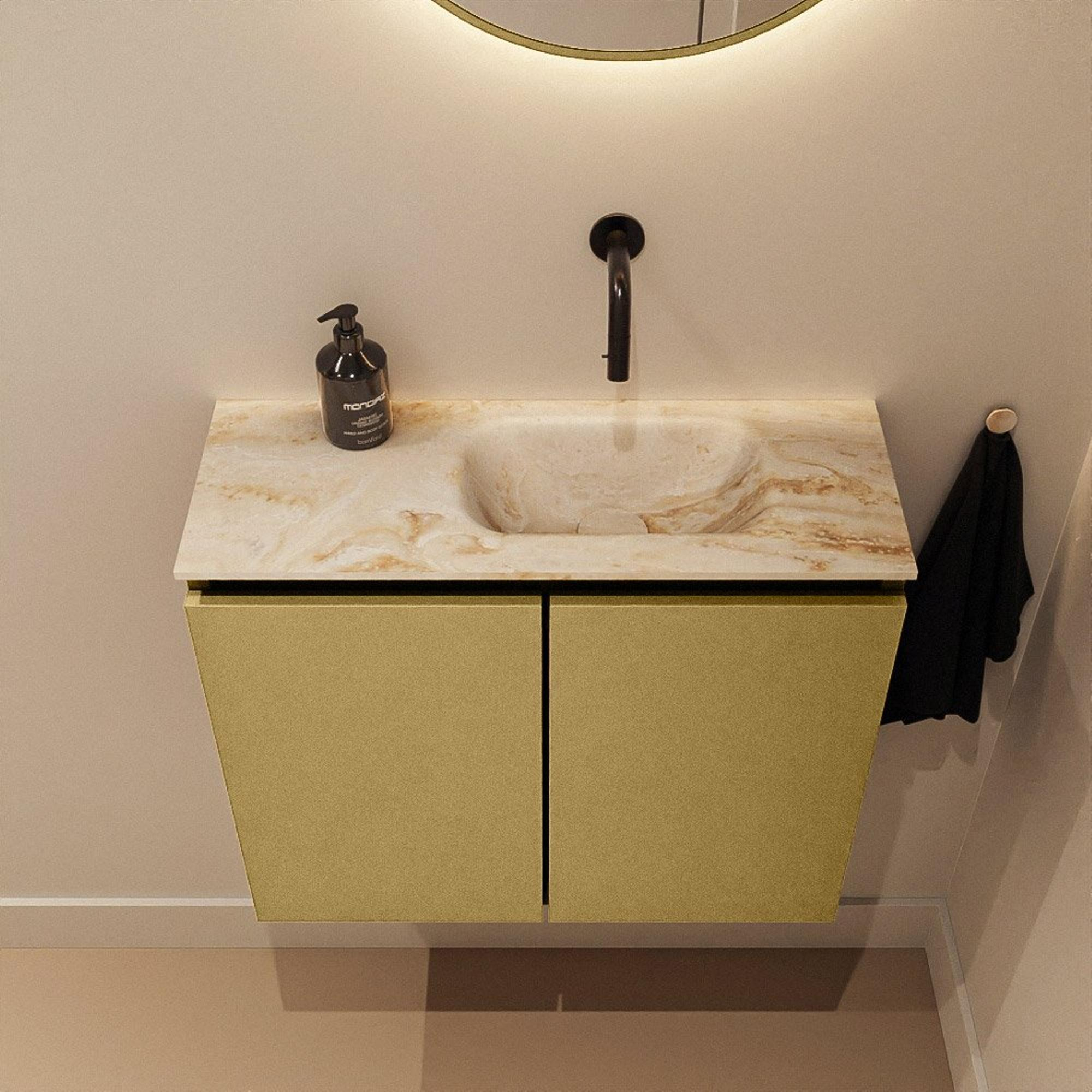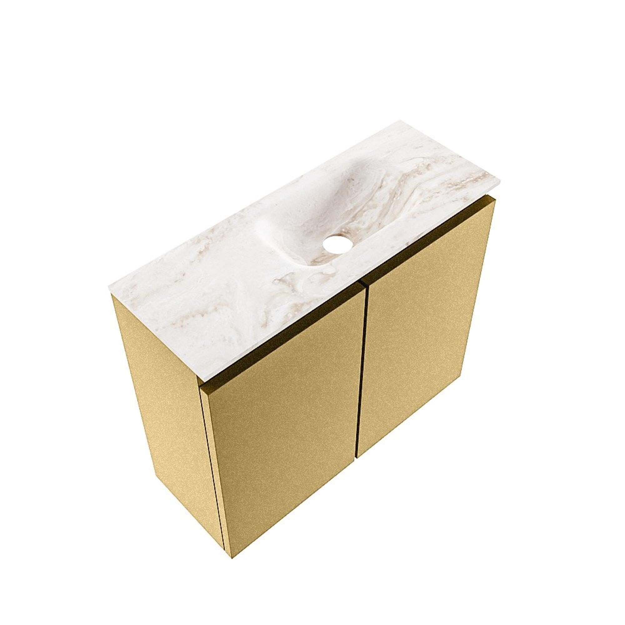 Vous recherchez un meuble compact et élégant pour vos toilettes ou une petite salle de bains, mais vous ne voulez pas faire de compromis sur l'apparence et la qualité ? Alors c'est un choix particulièrement judicieux. La combinaison d'un meuble de couleur or avec un plan de vasque en solid surface raffiné dans une douce teinte Frappe procure immédiatement une sensation d'hôtel de luxe, même dans un petit WC. Grâce à sa faible profondeur, ce meuble est idéal pour les espaces étroits ou des toilettes de couloir, tandis que la largeur de 60 cm offre suffisamment d'espace de travail autour du lavabo. La vasque est positionnée à droite et il n'y a pas de trou de robinet, ce qui est parfait si vous souhaitez utiliser un robinet mural pour un look ultra épuré et moderne. Vous créez ainsi, avec un espace minimal, un maximum d'effet design et un grand confort d'utilisation au quotidien.
