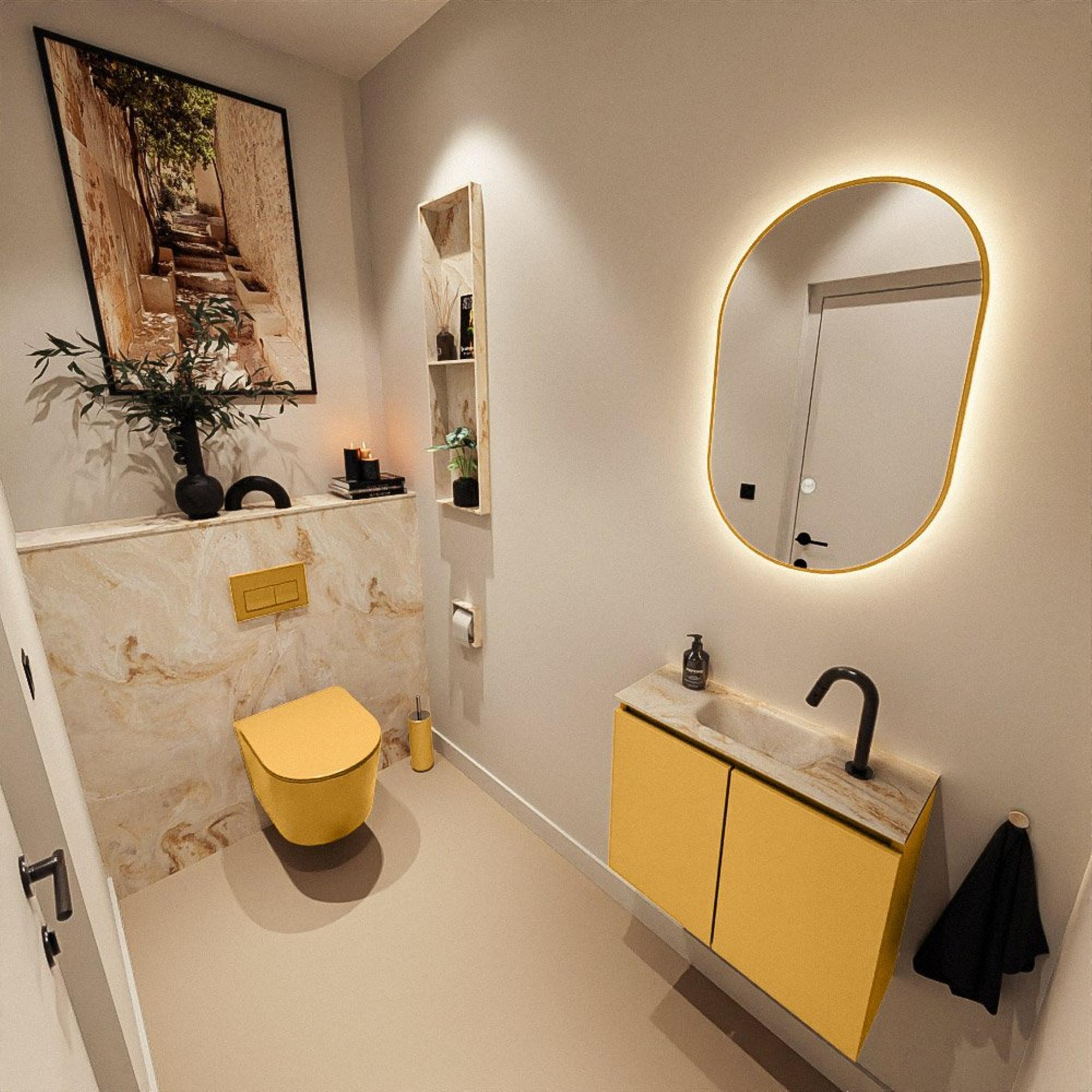 La combinaison du meuble Ocher avec le lavabo Eden dans la teinte Frappe donne à vos toilettes une apparence chaleureuse et contemporaine. Le meuble s'inscrit parfaitement dans les tendances actuelles de la salle de bains où les tons terre doux, le beige et les couleurs d'accent chaudes jouent le rôle principal. La couleur Ocher apporte du caractère sans être criarde, ce qui permet au meuble de se marier à merveille avec des carreaux clairs comme foncés. Les façades sans poignées renforcent le look épuré et minimaliste et donnent à l'ensemble une allure sobre et haut de gamme. Vous offrez ainsi à vos toilettes invités une véritable mise à niveau design, sans avoir à rénover entièrement la pièce.