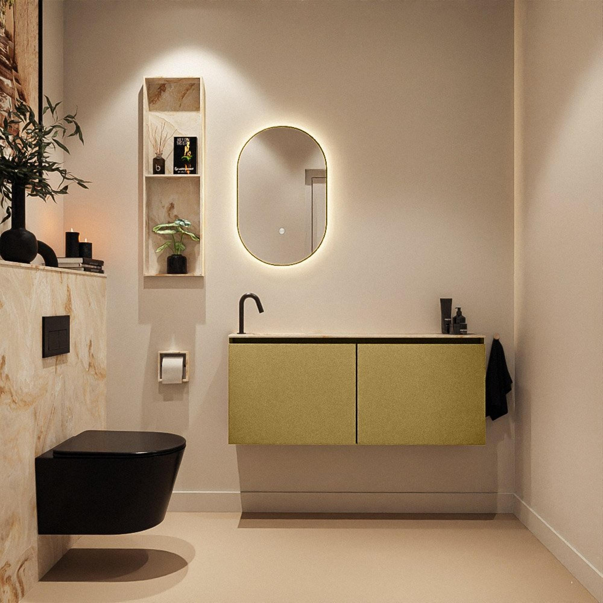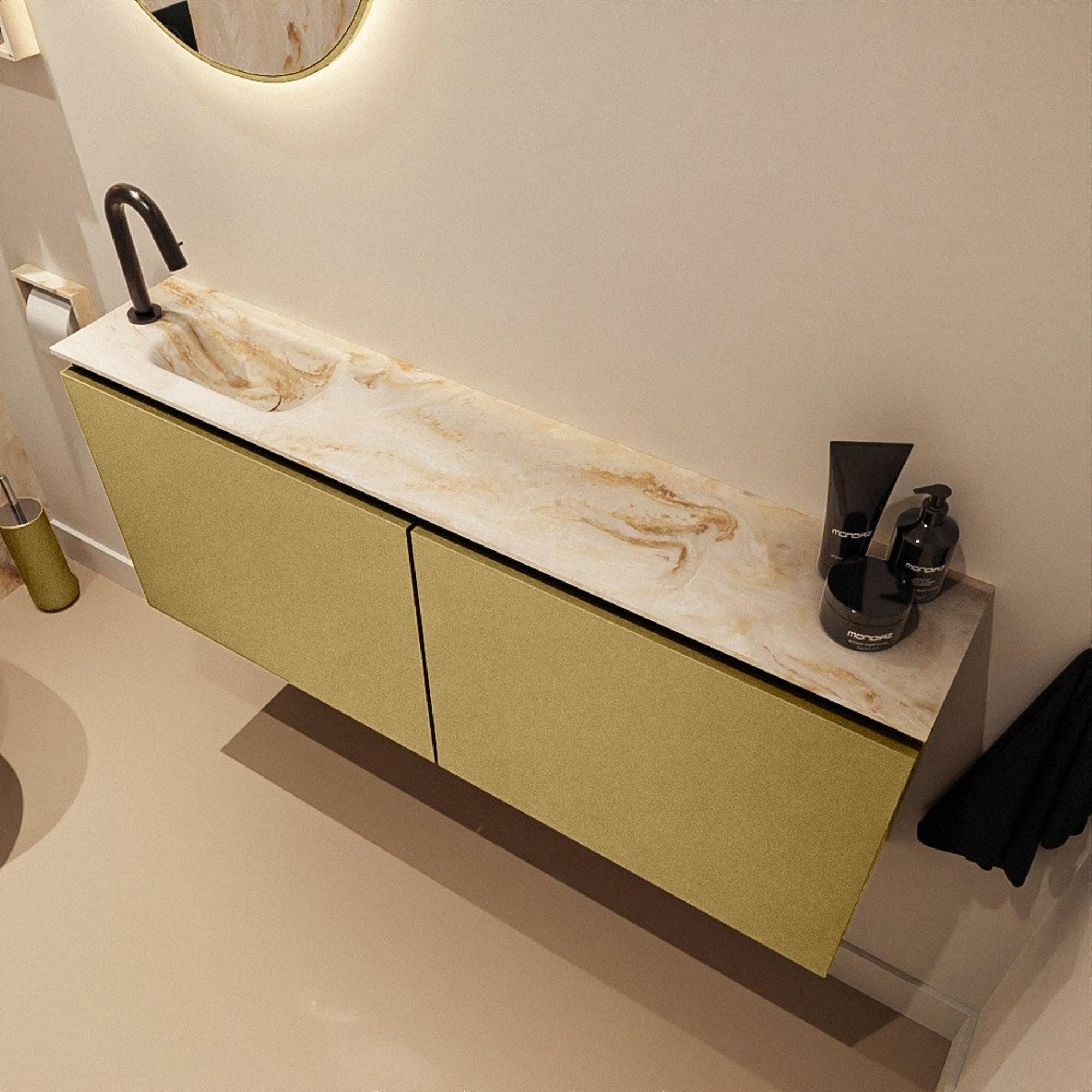- Association de couleurs luxueuse : meuble doré (Oro) avec lavabo en solid surface beige (Frappe)
