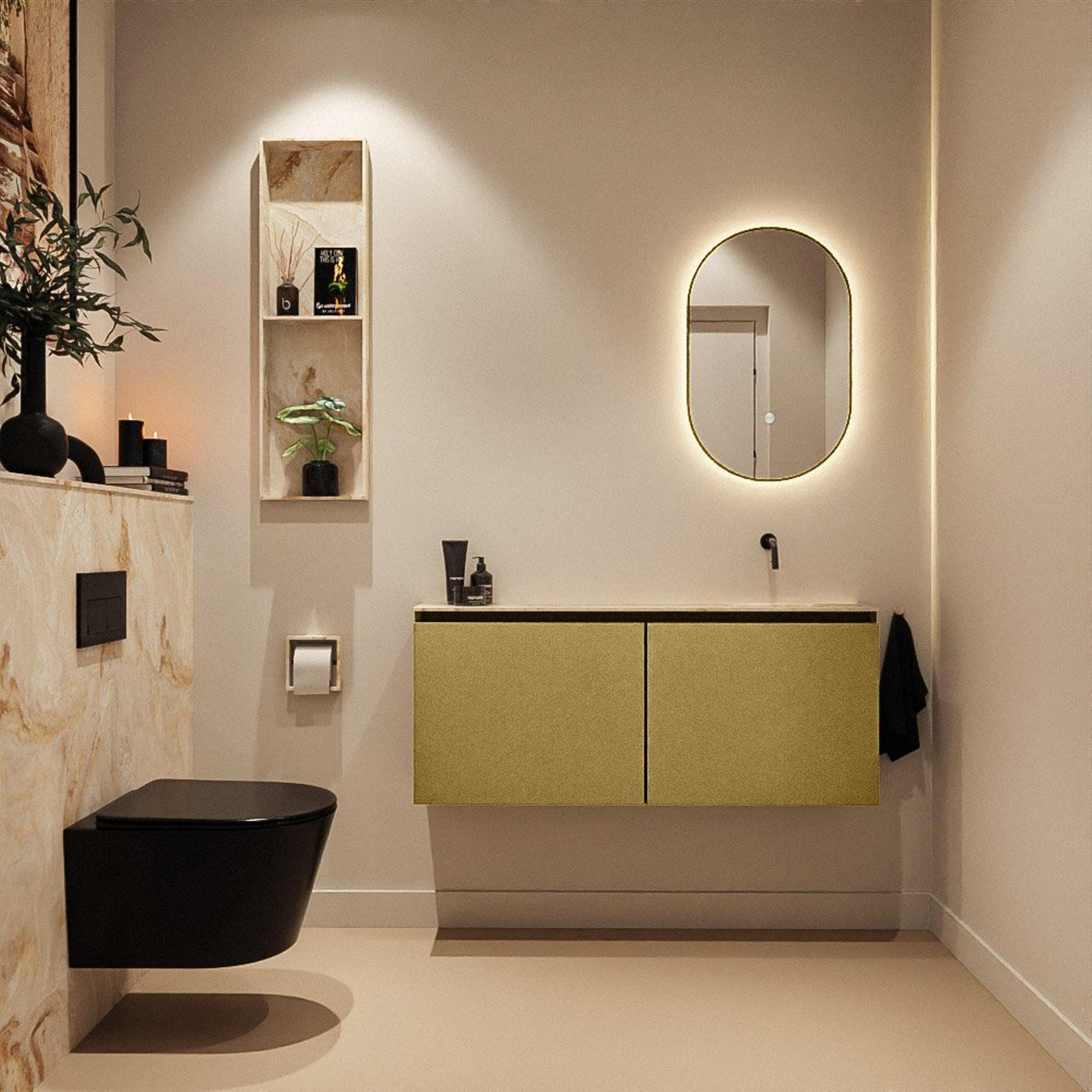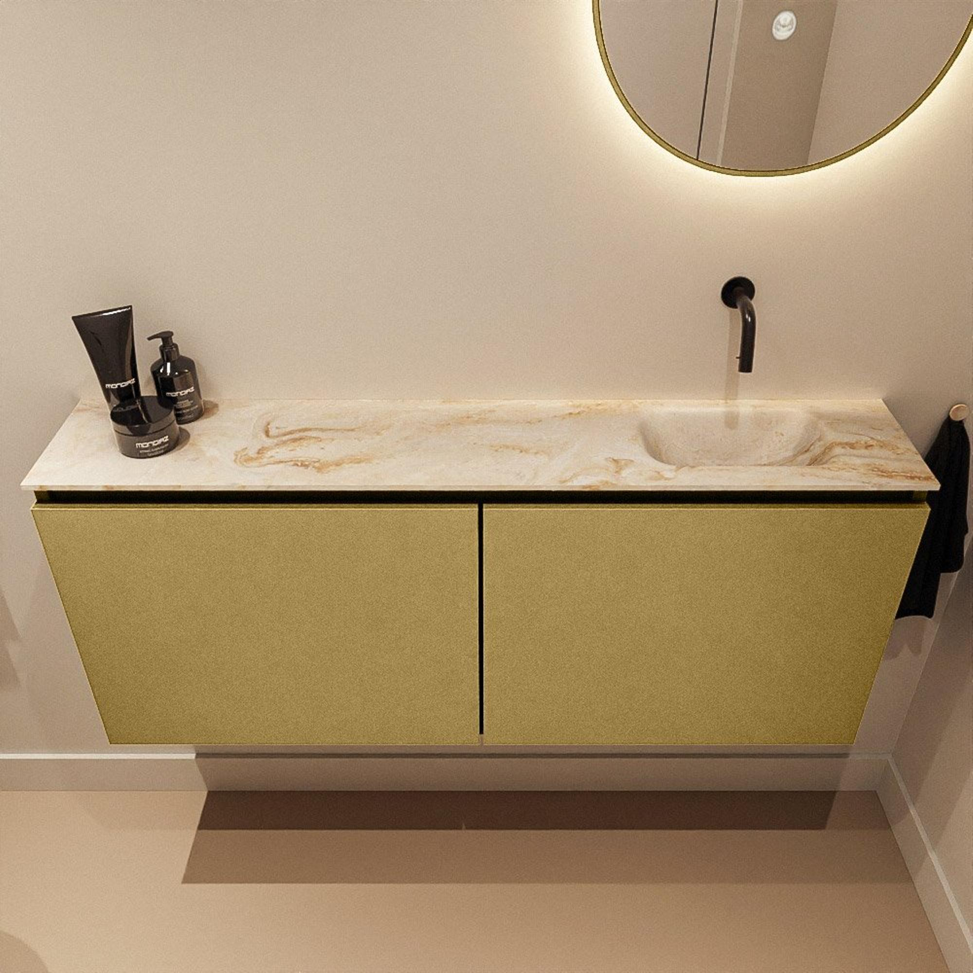 - Meuble élégant de couleur or (Oro) combiné avec lavabo Eden en Frappe pour une apparence chaleureuse et luxueuse.