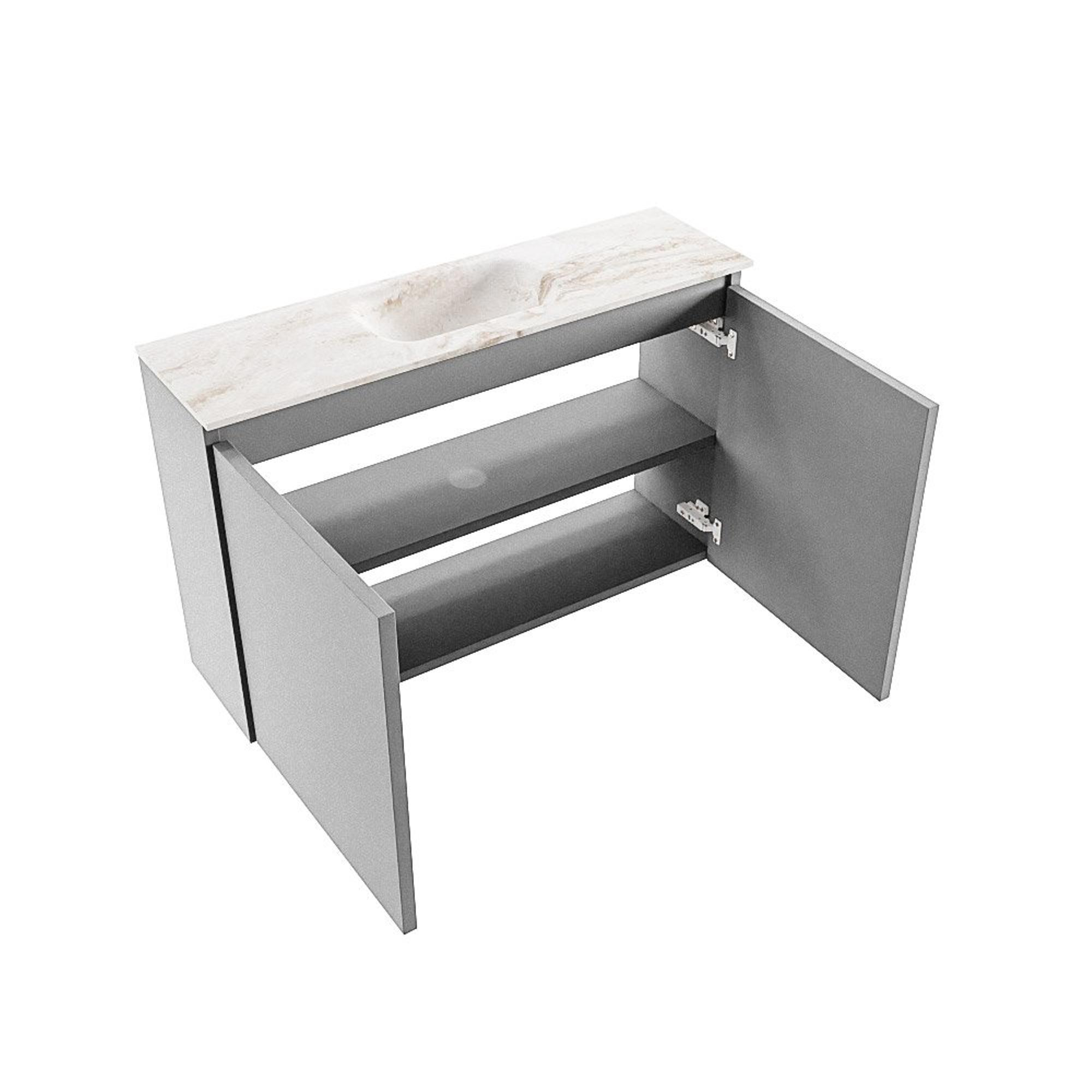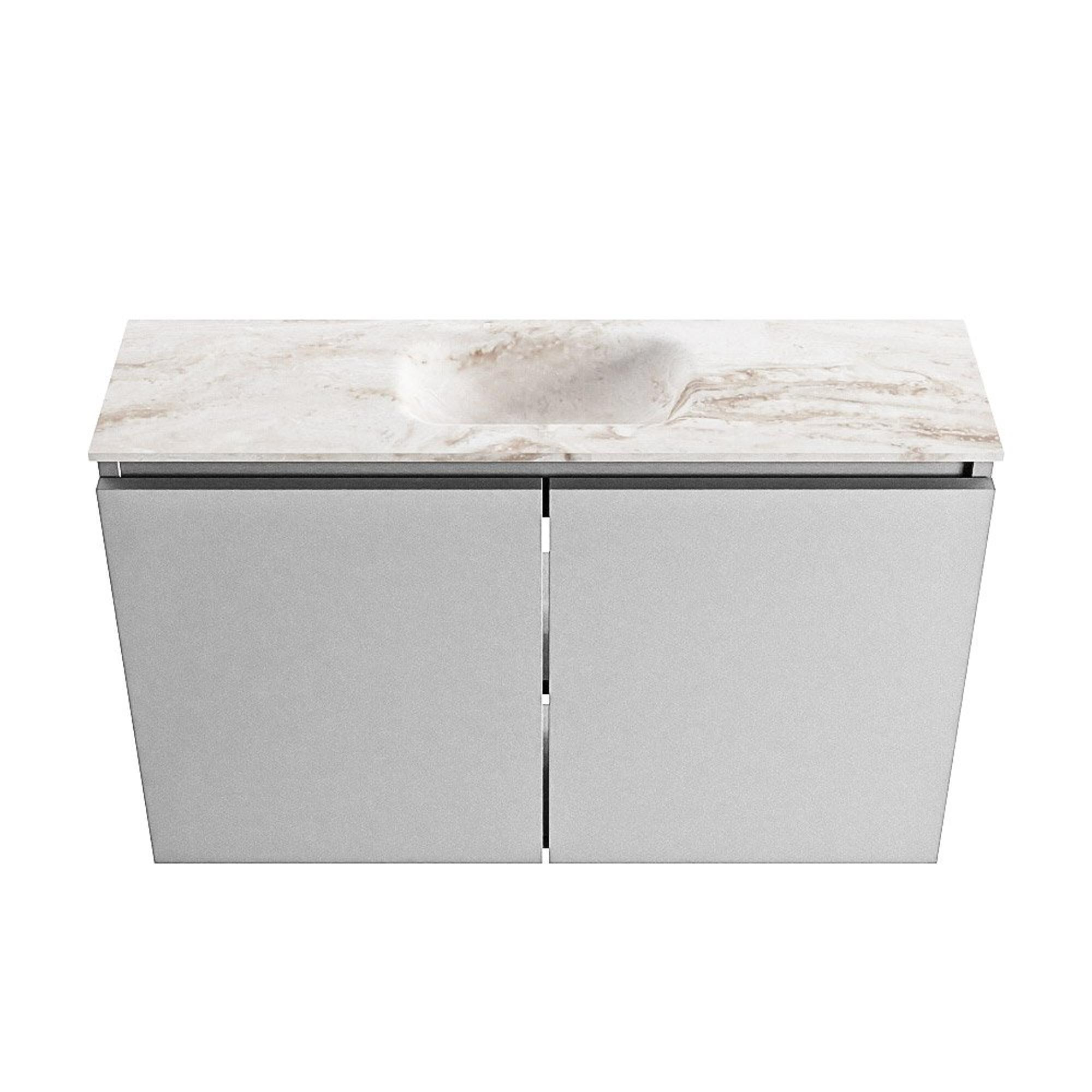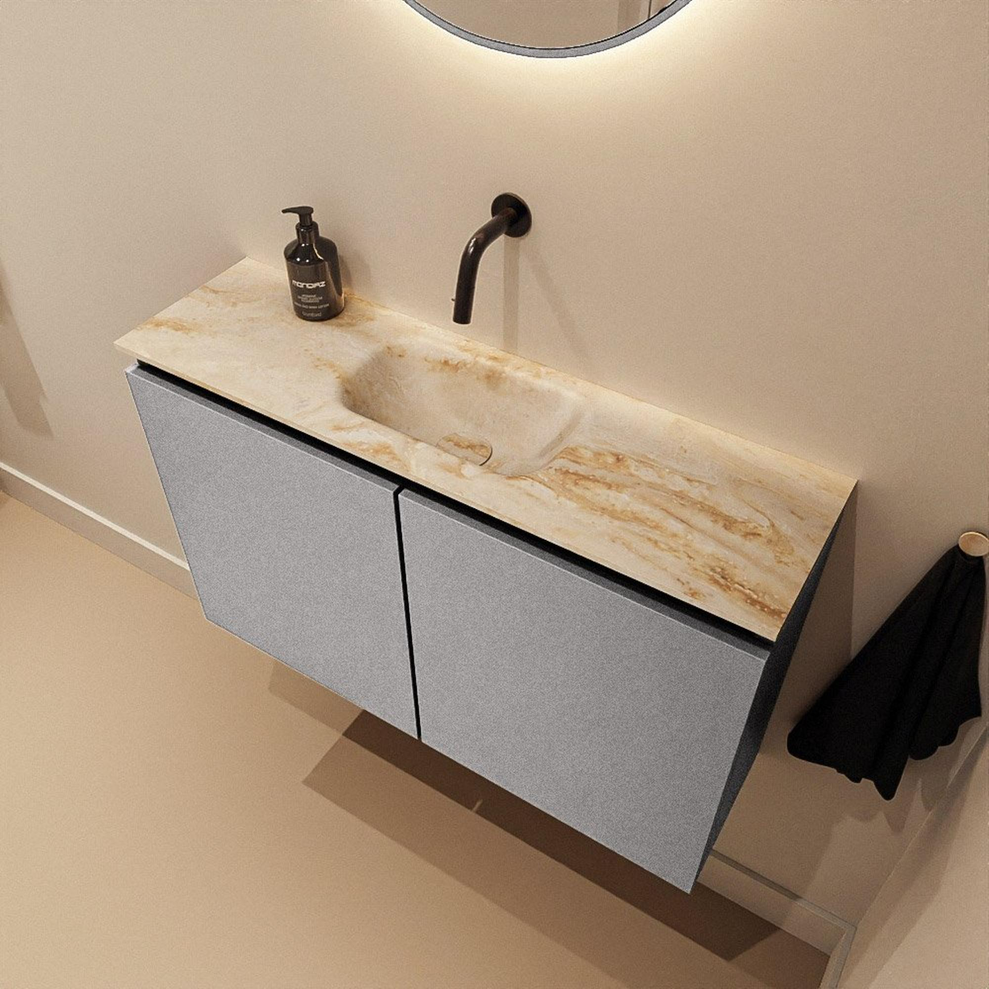 Vous cherchez un meuble à la fois élégant et super pratique pour vos toilettes ou votre petite salle de bains ? Ce meuble compact avec faible profondeur combine un petit meuble moderne et épuré avec un plan vasque en solid surface sans joints. Idéal si vous disposez de peu d’espace mais souhaitez tout de même une apparence luxueuse. Grâce aux portes sans poignées, l’ensemble a un aspect calme et minimaliste, tout en offrant suffisamment d’espace de rangement pour, par exemple, les produits d’entretien, les serviettes invités ou les produits de réserve. La combinaison de la couleur grise du meuble et du lavabo beige chaleureux s’intègre parfaitement dans les salles de bains modernes, mais se marie aussi très bien avec des matériaux naturels tels que le bois et le béton ciré. En l’absence de trou de robinet, vous pouvez choisir vous-même un mitigeur surélevé assorti ou opter pour une solution encastrée dans le mur. Cela en fait un choix malin si vous souhaitez créer des toilettes au design épuré et bien pensé, où chaque détail compte.