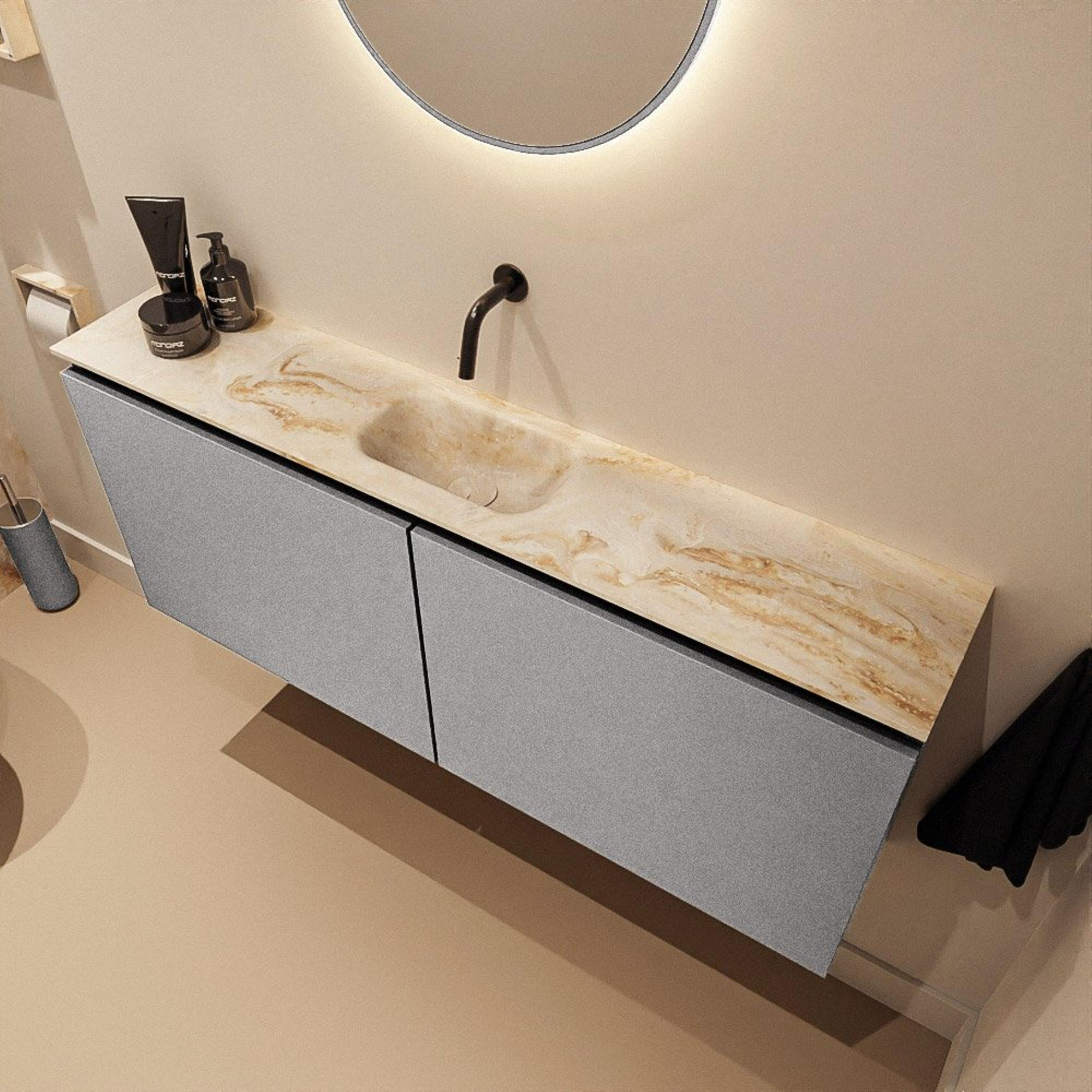 Si vous cherchez un meuble de toilettes sobre et bien pensé pour vos WC ou une salle de bains compacte, cette combinaison est un choix particulièrement astucieux. La faible profondeur le rend idéal pour les espaces étroits ou un WC d’invités moderne, où vous souhaitez une solution de lavabo complète sans perdre de profondeur. La combinaison d’un meuble fin avec un plan vasque en Solid Surface sans joints et un lavabo intégré offre un aspect calme et luxueux, créant immédiatement une apparence soignée et design. La teinte grise Plata du meuble et le lavabo Eden beige en couleur Frappe s’accordent parfaitement avec les styles de salle de bains populaires tels que moderne, scandinave et hôtel chic. Grâce à la version sans trou de robinet, vous pouvez en plus choisir vous-même un robinet surélevé ou mural assorti, afin que l’ensemble s’harmonise parfaitement avec le reste de vos équipements sanitaires.