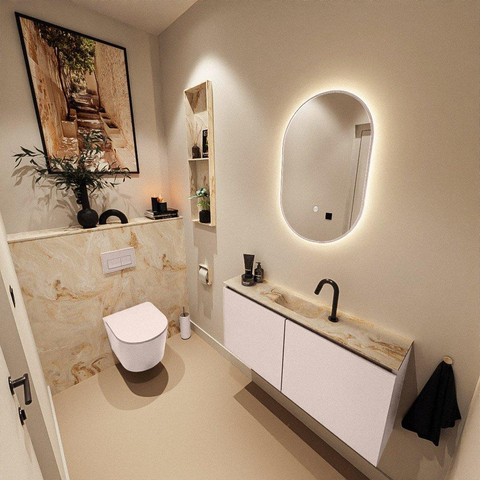 La couleur rose douce du meuble (Rosee) donne immédiatement à vos toilettes une apparence chaleureuse et personnalisée. Le plan Frappe beige en solid surface avec un subtil effet marbre y apporte une touche de style et de luxe. Cette combinaison se marie à merveille avec des carreaux modernes, des tons de bois clairs et des robinets noirs ou en laiton, ce qui vous permet de créer facilement un ensemble harmonieux. Comme le trou de robinet est placé au centre, vous pouvez utiliser un beau mitigeur de lavabo design comme véritable point de mire. Le résultat est un meuble WC qui n'est pas seulement fonctionnel, mais qui devient également un véritable créateur d'ambiance dans votre intérieur.