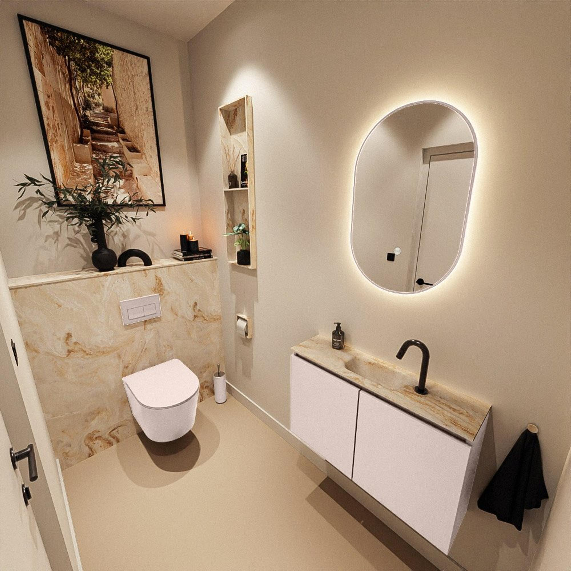 Avec une largeur de 80 cm et une profondeur de seulement 23 cm, vous exploitez au mieux l’espace disponible, sans que cela paraisse exigu. Sa faible profondeur rend ce meuble particulièrement adapté aux toilettes étroites ou à une salle de bains compacte, tout en vous offrant un lavabo pleinement fonctionnel. Comme la vasque est positionnée au centre, vous disposez à gauche et à droite de suffisamment de surface de dépose pour le savon ou un accessoire décoratif. La fixation murale crée en outre un effet de légèreté : le sol reste dégagé, ce qui donne à la pièce une impression d’espace et de clarté, et facilite également le nettoyage.