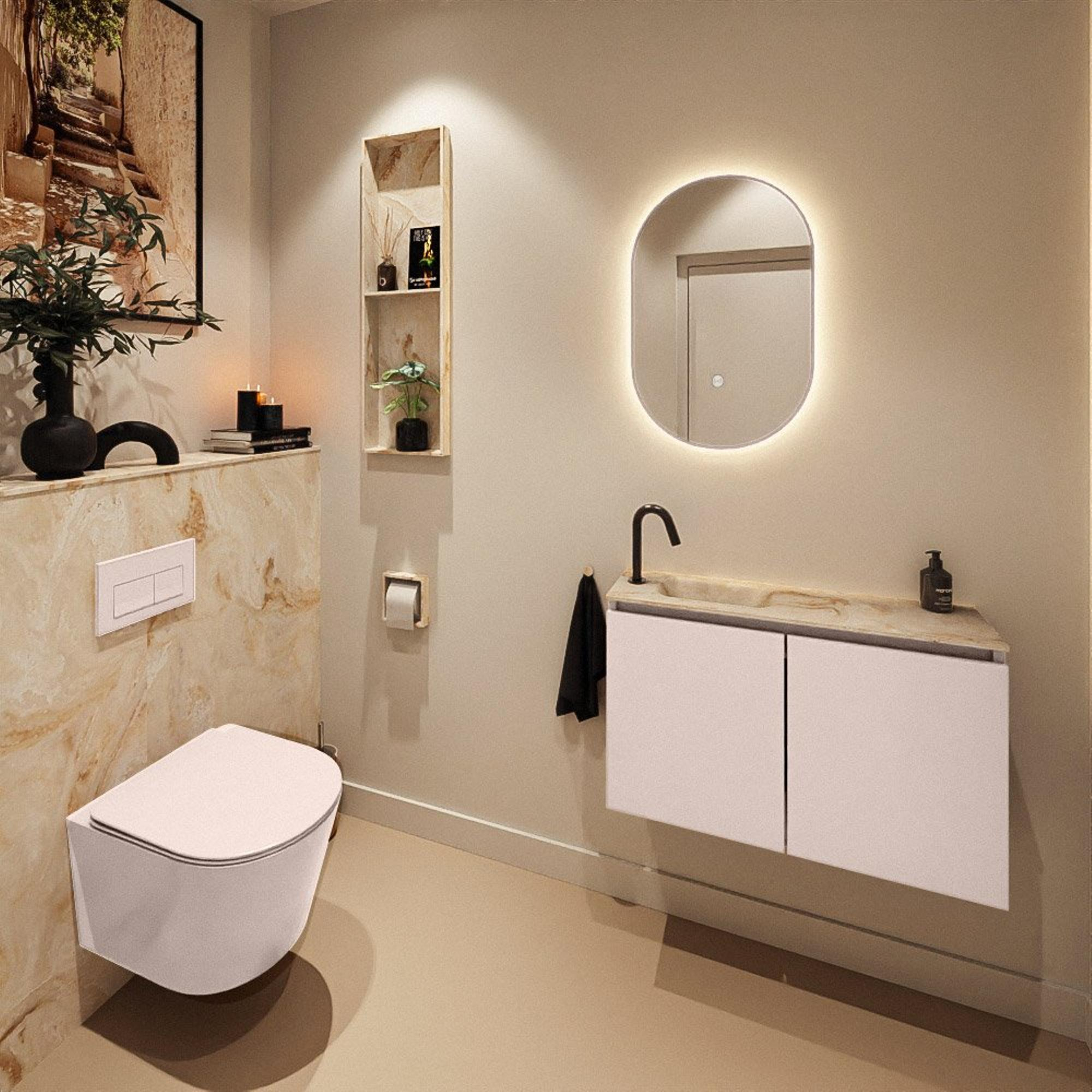 Vous cherchez un meuble de toilettes peu profond et élégant qui s’intègre parfaitement dans des toilettes modernes ou une petite salle de bains, sans compromettre l’espace de rangement et le confort ? Alors cette combinaison avec meuble rose doux et lavabo beige est un choix judicieux. Grâce à la faible profondeur, le meuble empiète à peine sur l’espace, ce qui vous permet de vous déplacer aisément même dans des toilettes étroites. Le lavabo avec trou de robinet à gauche est idéal si, par exemple, vous avez un WC suspendu ou une porte dont la position demande une réflexion supplémentaire dans l’agencement. En même temps, la double porte offre suffisamment d’espace pour ranger hors de vue les rouleaux de papier toilette, serviettes invité et produits d’entretien, de sorte que vos toilettes paraissent toujours calmes et ordonnées. La palette de couleurs moderne aux teintes subtiles et chaleureuses s’accorde parfaitement avec les tendances contemporaines en matière de carrelage, du béton ciré au carrelage en chevrons, et fait de ce meuble une excellente base pour des toilettes conviviales et bien pensées.