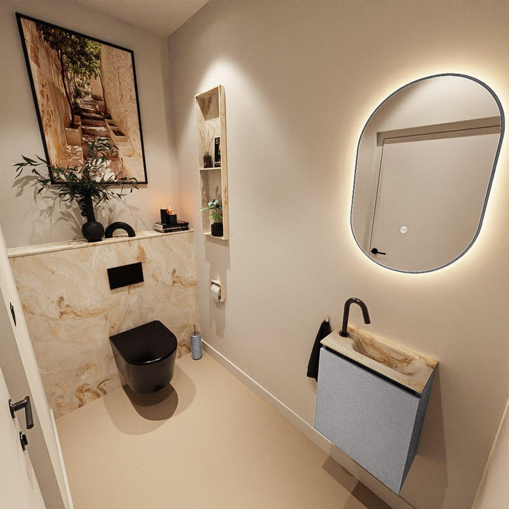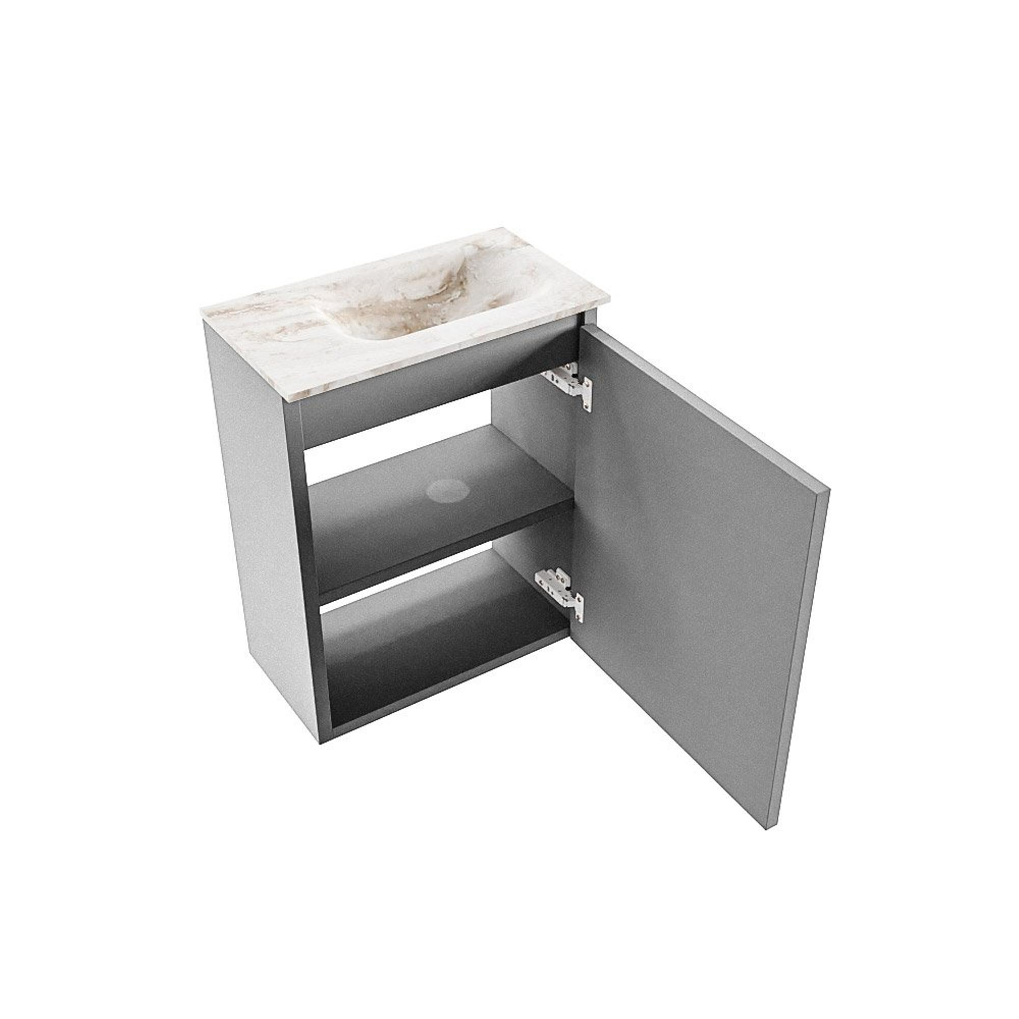 La teinte de gris moderne du meuble s'accorde parfaitement avec les tendances actuelles en matière de salles de bains. La couleur Plata offre un rendu épuré et intemporel, tandis que le plan dans la teinte Frappe – un marbre beige doux – apporte chaleur et luxe. Cette combinaison rend le meuble facile à associer aussi bien avec des carreaux clairs ou foncés, qu'avec des robinets noirs ou chromés et divers accessoires. Les façades sans poignée renforcent l'aspect calme et minimaliste : aucune poignée interrompant la surface, mais un panneau lisse qui confère immédiatement à vos toilettes ou à votre petite salle de bains une allure haut de gamme. Ce meuble devient ainsi un élément discret mais raffiné, qui ne domine pas l'espace mais montre clairement le soin apporté au style et à la finition.