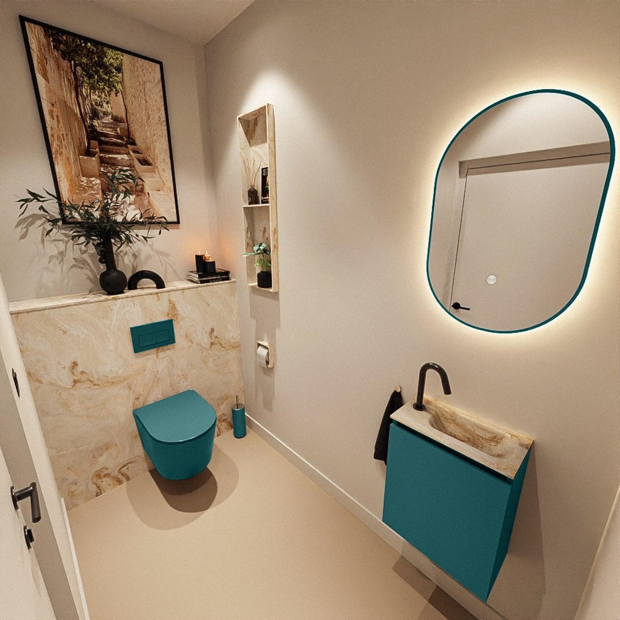 Le meuble de couleur Smag - une teinte moderne tirant sur le vert - forme un magnifique contraste avec le lavabo Frappe dans un ton beige-blanc. Cette combinaison crée une association de couleurs contemporaine et subtile qui s'intègre parfaitement dans un style de salle de bains moderne ou scandinave, mais qui ressort également très bien dans un intérieur plus naturel et apaisant. La façade sans poignée confère à l'ensemble un caractère épuré et minimaliste, mettant particulièrement en valeur les lignes du meuble. Grâce à cette conception sobre, votre espace toilettes reste ordonné et luxueux, même si la pièce est petite. Vous faites ainsi entrer chez vous un meuble non seulement pratique, mais qui contribue réellement à l'esthétique de votre intérieur.