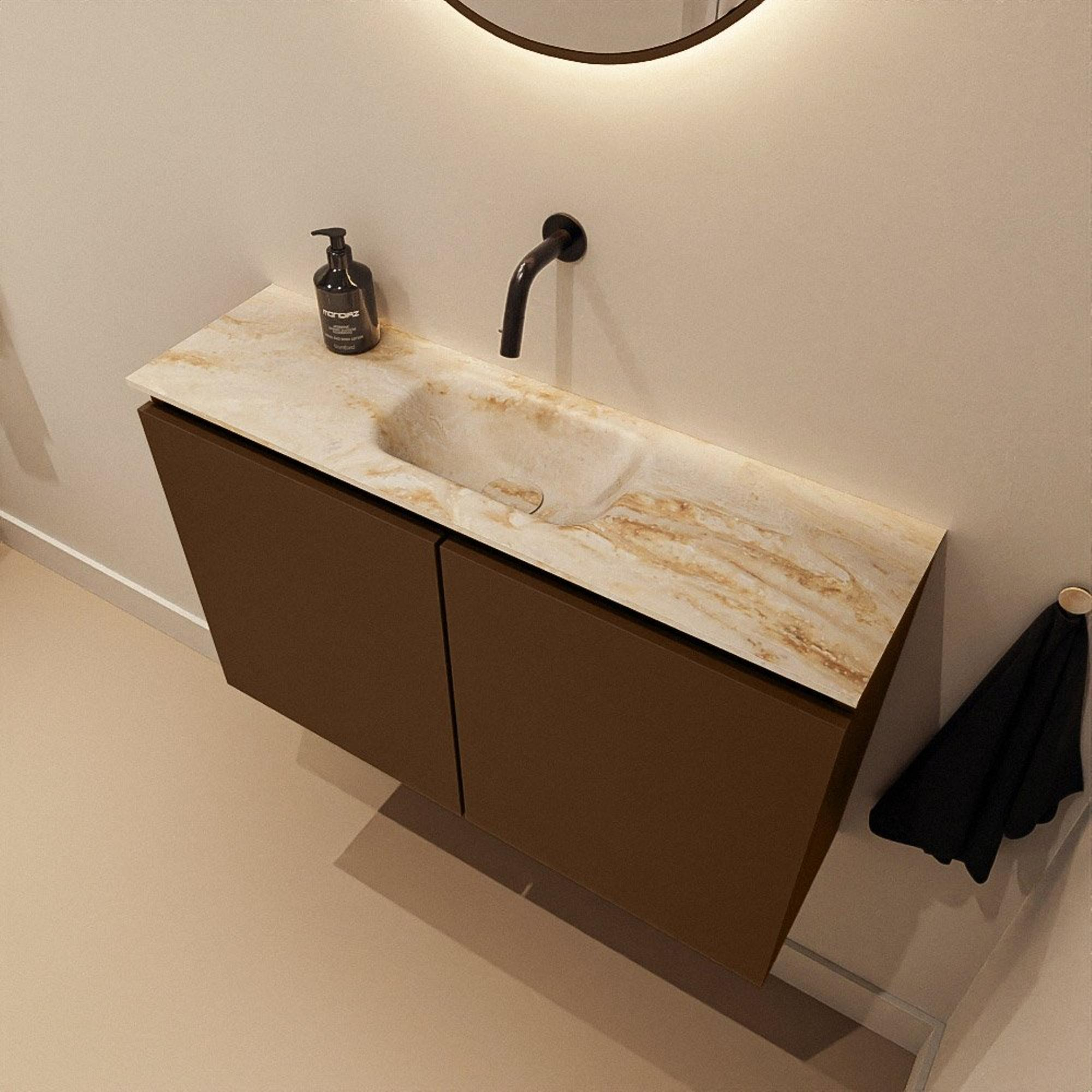 La teinte brune chaude du meuble dans la couleur Rust crée immédiatement une atmosphère agréable et s'intègre parfaitement dans un style moderne, mais aussi hôtel chic ou orienté nature. Le Frappe beige clair du lavabo en Solid Surface apporte un contraste subtil qui respire le luxe sans être criard. Ces couleurs se combinent facilement avec des robinets et accessoires noirs, chromés ou en métal brossé, ce qui vous laisse une grande liberté pour le reste de la conception de votre salle de bains ou de vos toilettes. Les façades sans poignées soulignent les lignes épurées et confèrent un aspect minimaliste et haut de gamme.