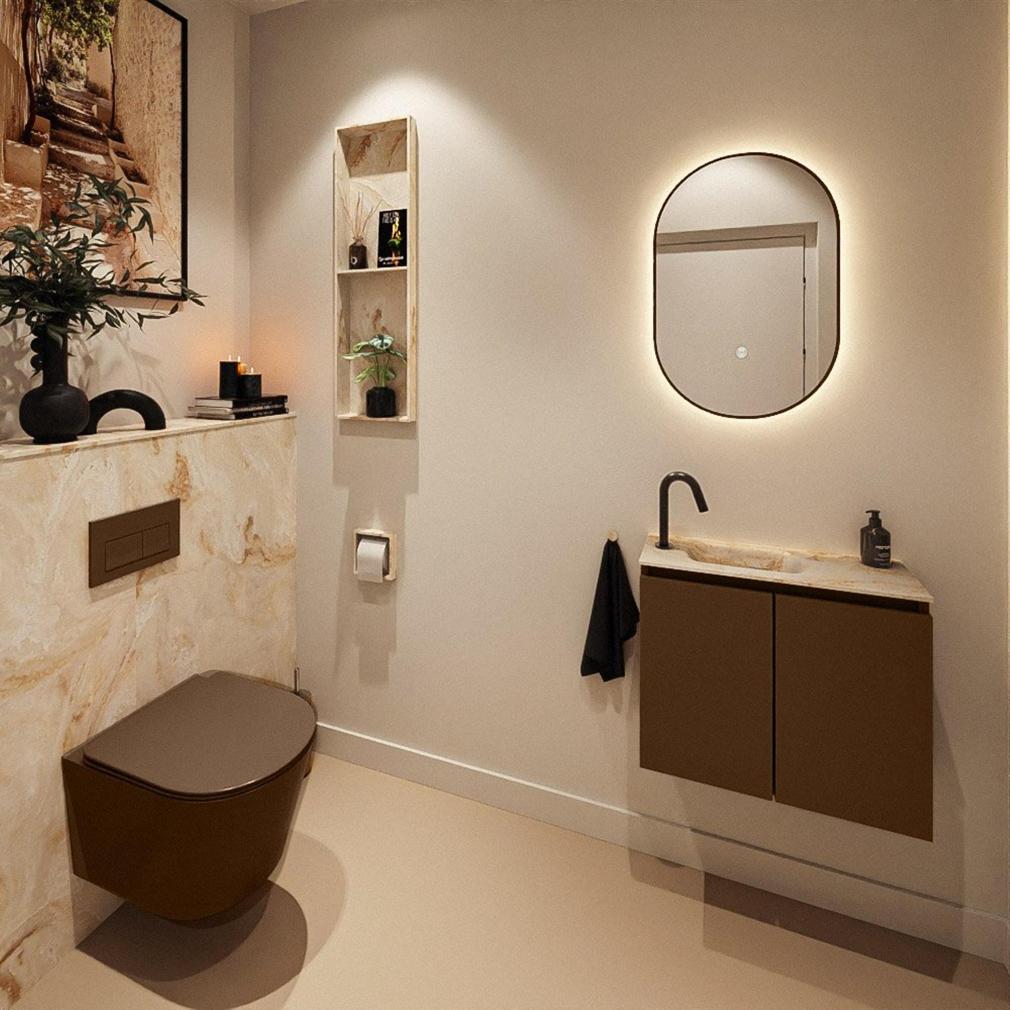 La couleur Rust donne au meuble un aspect chaleureux et naturel qui se marie parfaitement avec des carrelages clairs comme foncés. Le lavabo Frappe en solid surface beige y ajoute une touche moderne et luxueuse : lignes droites, surface plane et très raffinée en termes d’apparence. Cette combinaison fonctionne parfaitement dans des toilettes modernes de style hôtel, mais aussi dans des salles de bains scandinaves ou naturelles avec beaucoup de bois et de tons doux. Comme le meuble et le lavabo sont tous deux réalisés dans des couleurs neutres, ils se combinent facilement avec différents coloris de robinets, comme le chrome, le noir ou le laiton brossé. Vous pouvez ainsi, grâce à votre choix de robinet, accentuer le style selon vos goûts, d’un design minimaliste et moderne à une atmosphère chaleureuse et chic.