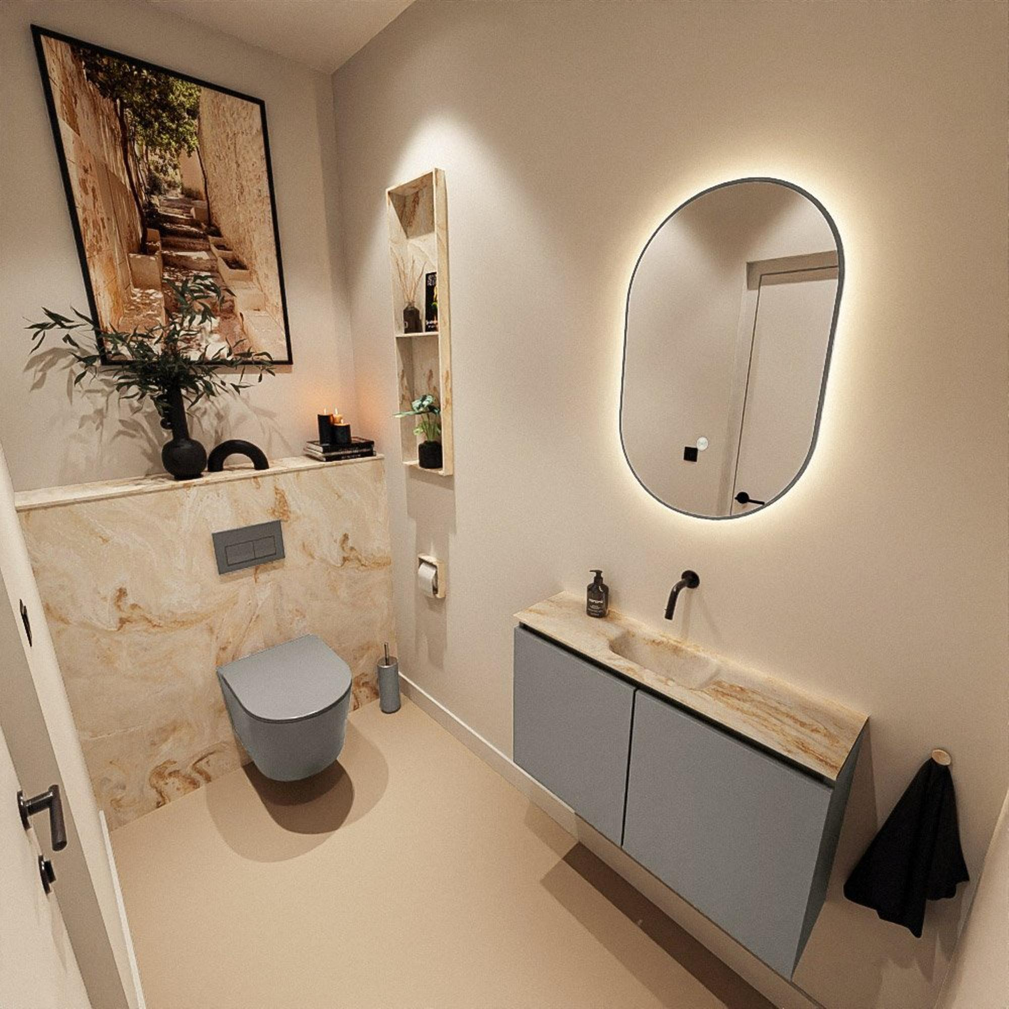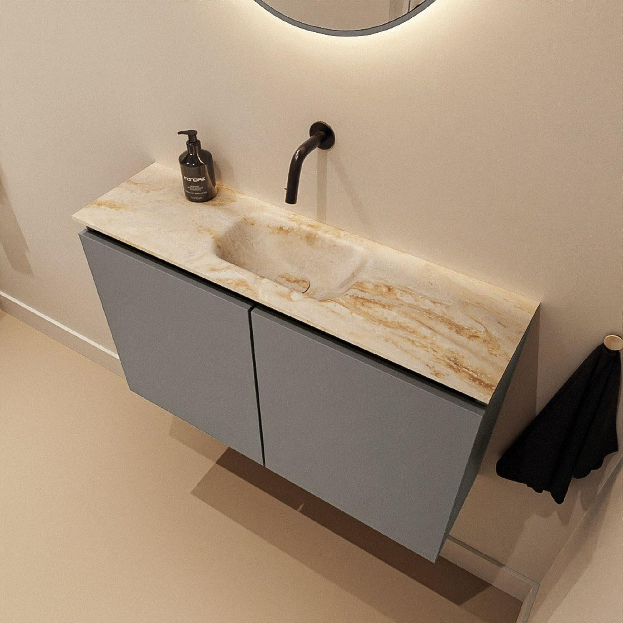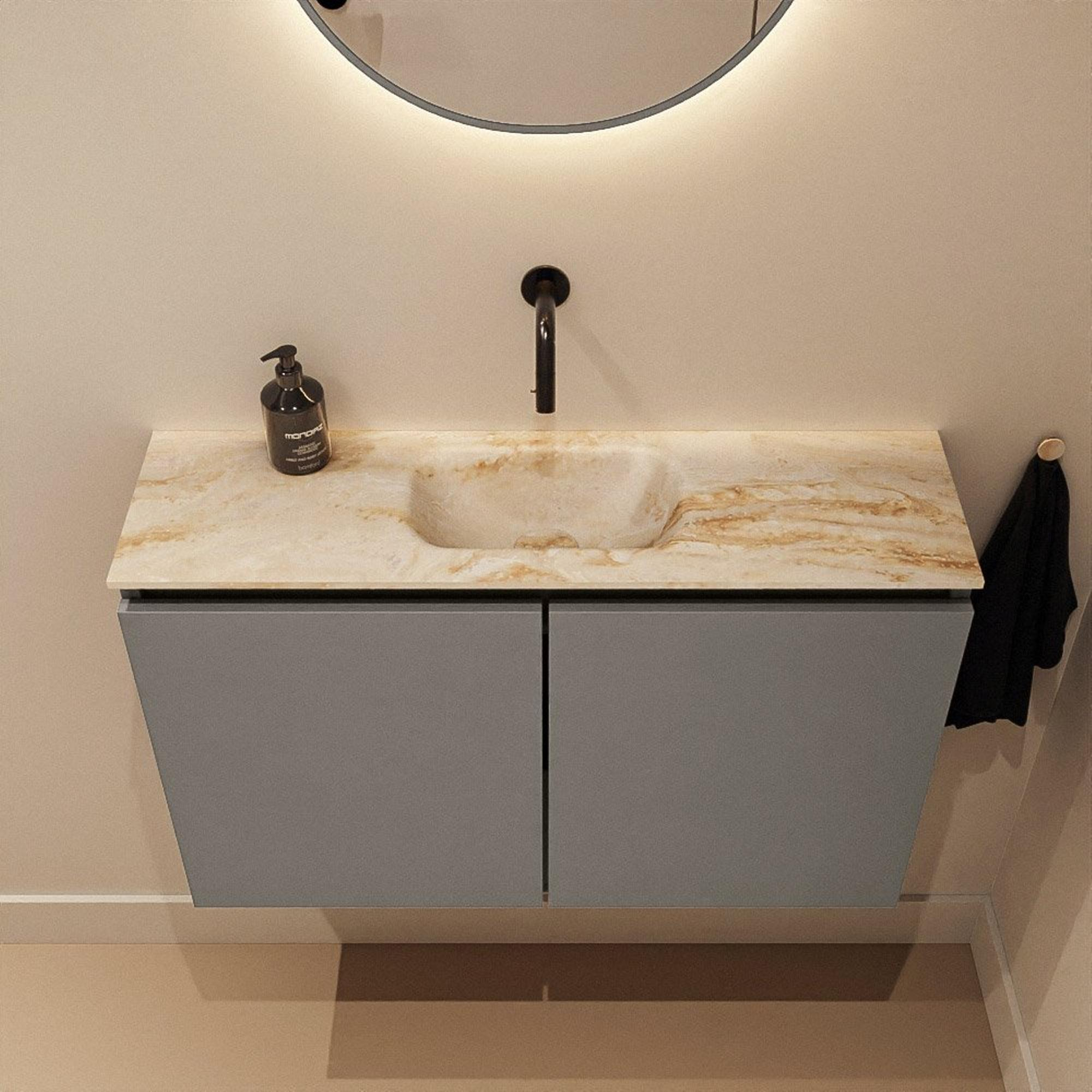 La combinaison de la couleur Smoke (anthracite) pour le meuble et de la teinte Frappe du lavabo Eden confère une atmosphère contemporaine, presque hôtelière, à vos toilettes. Le meuble foncé apporte profondeur et caractère à l’intérieur, tandis que le plan en Solid Surface beige forme un contrepoint doux et naturel. Ce mélange s’accorde parfaitement avec les salles de bains modernes avec béton ciré, accents bois ou carreaux effet marbre. Comme le meuble est sans poignées, les lignes restent épurées et calmes, ce qui crée un ensemble ordonné, surtout dans les petits espaces. Cela en fait un choix idéal si vous recherchez un style moderne et intemporel que vous pouvez facilement compléter avec des robinets et accessoires noirs, chromés ou en métal brossé.